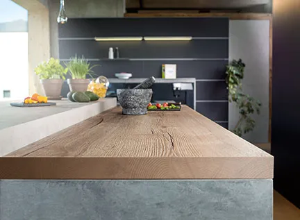 A primera vista parece madera maciza: la percepción de la veta es a la vez óptica y háptica. Las superficies nuevas con poros sincronizados por ambas caras transmiten una sorprendente naturalidad.
