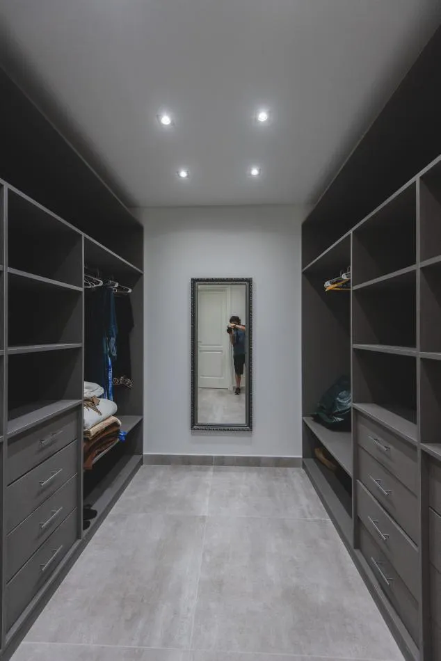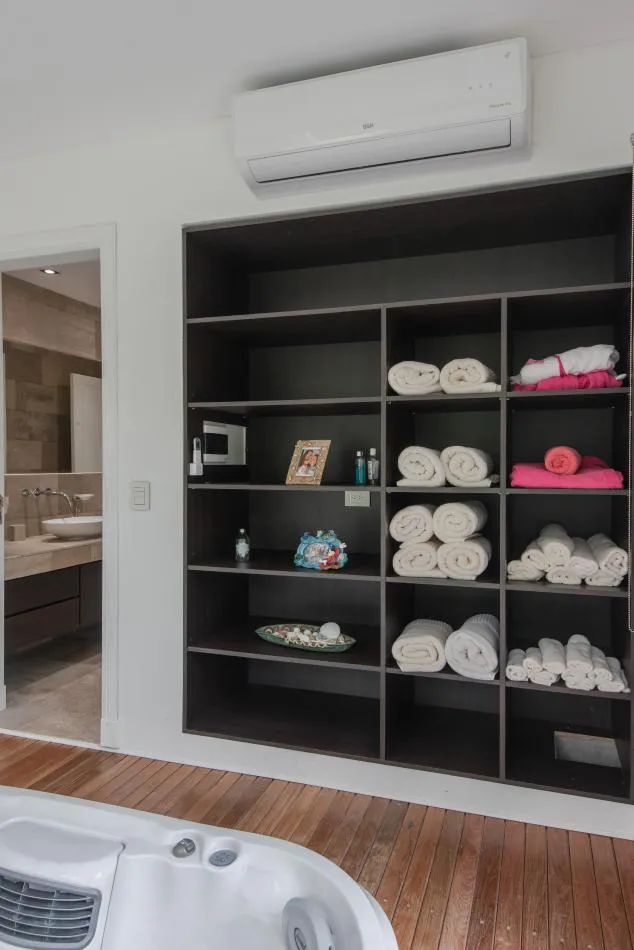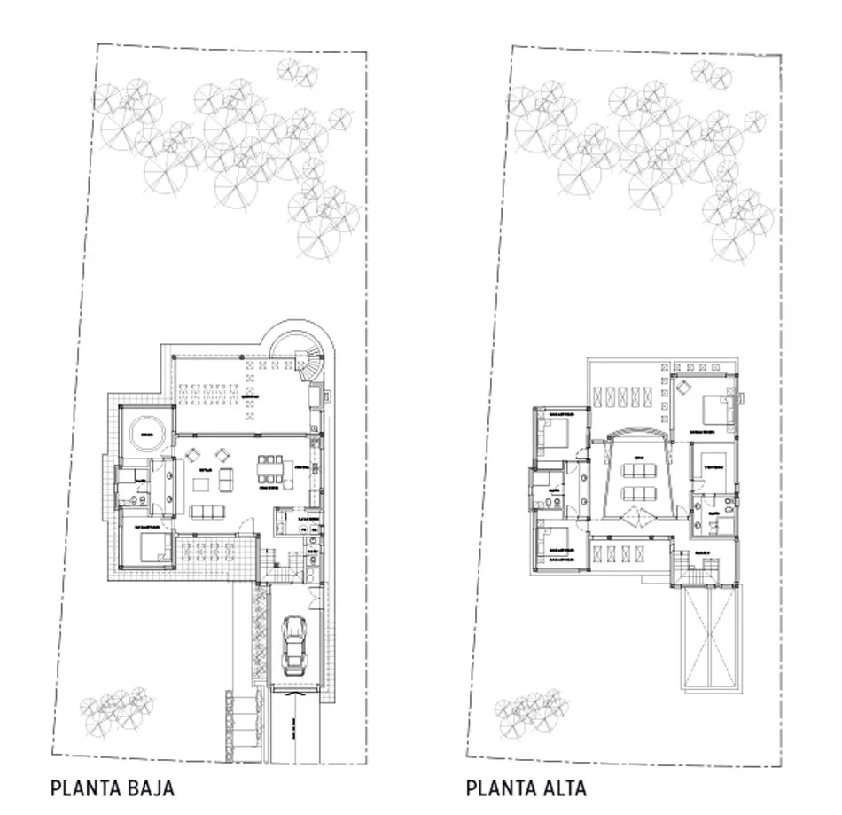 Como cada vivienda cuenta la historia de sus propietarios y sus deseos, en su fachada ya se puede apreciar uno de los espacios que funciona como corazón de la vivienda una sala de cine ubicada en la planta alta: conformada por un volumen que sobresale para darle identidad a este ambiente tan especial e importante para sus habitantes, grandes amantes del cine.