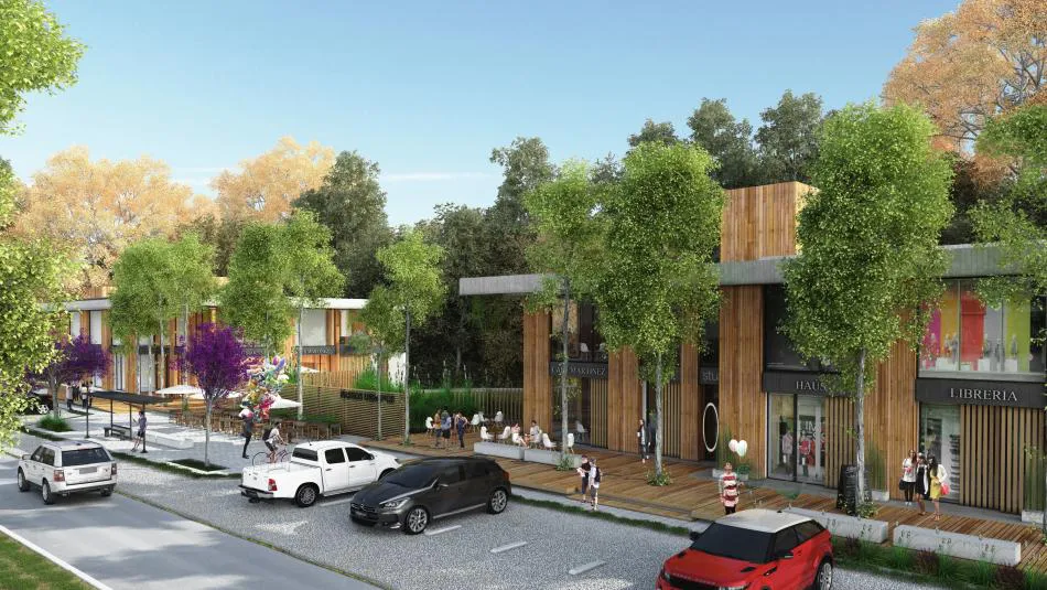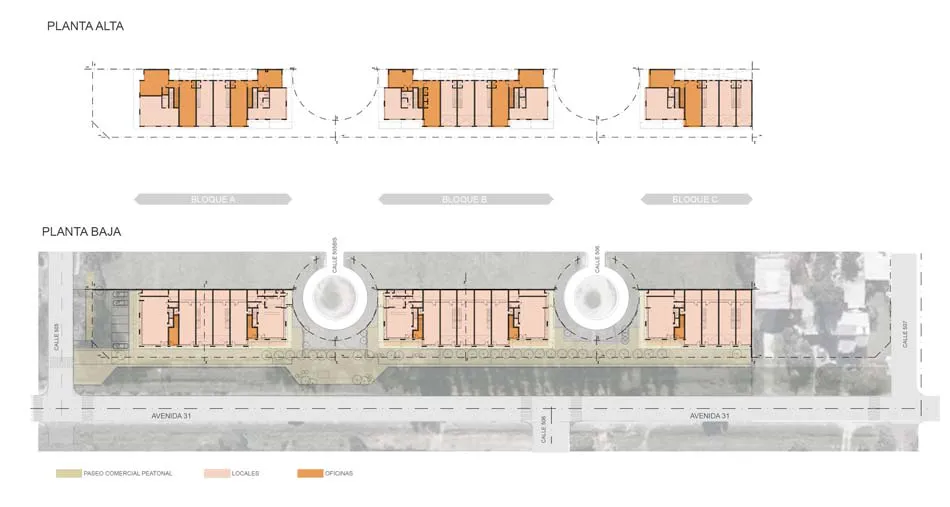 El proyecto se organiza en tres bloques de dos niveles de altura articulados por pequeñas plazas, sobre un paseo peatonal de 200 metros de recorrido con frente a calle 31, contemplando espacios semicubiertos, pequeñas plazoletas, sector de juegos infantiles, espacios de expansión y equipamiento urbano (mobiliario, refugios para paradas de micros, iluminación, áreas de estacionamiento vehicular y bicicletas, etc).
