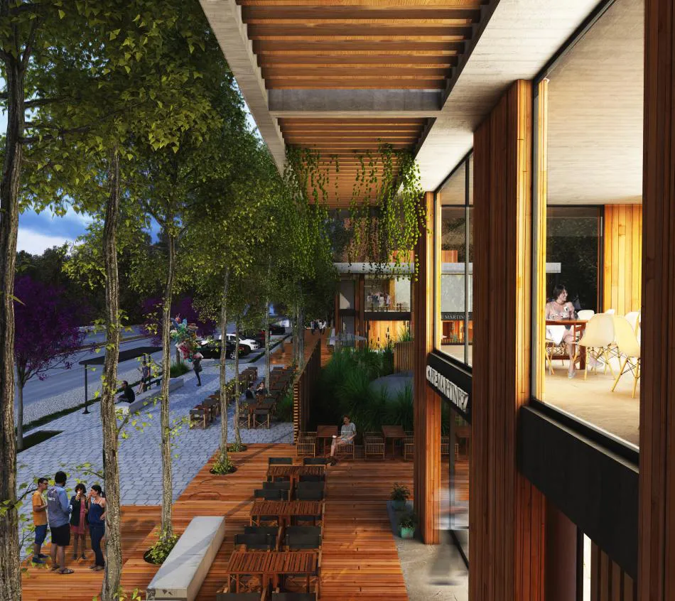 El paseo proyectado por el estudio Amado Arquitectos propone contribuir a la conformación de esa identidad. En este sentido, la característica singular del conjunto es la creación de un paseo peatonal constituido por un generoso retiro de frente, que intenta brindar a la ciudad un nuevo ámbito para el encuentro y el desarrollo de la vida social.