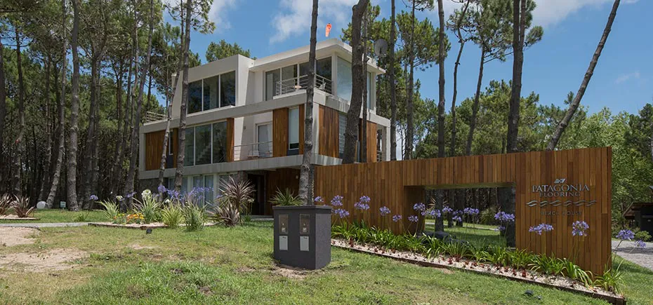 Por otra parte, cabe destacar que la materialidad de la obra refleja las diferenciaciones funcionales, sobresaliendo el volumen intermedio de hormigón visto (también empleado en los cielorrasos de la casa) y lapachos naturales con tratamiento prefinish; ambos materiales se caracterizan por su nobleza para este medio ambiente marino, y además poseen la particularidad de que requieren bajo mantenimiento. También se incorporó piedra a modo de basamento en la planta baja, y donde se requirió de mayor liviandad visual se empleó revestimiento plástico texturado fino. Las barandas se definieron en acero inoxidable y vidrios templados laminados.