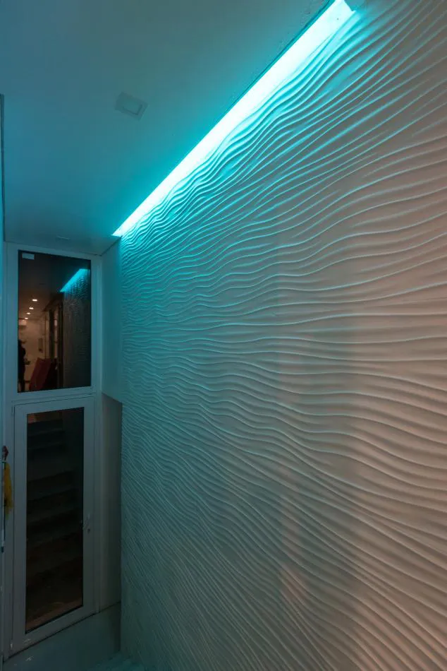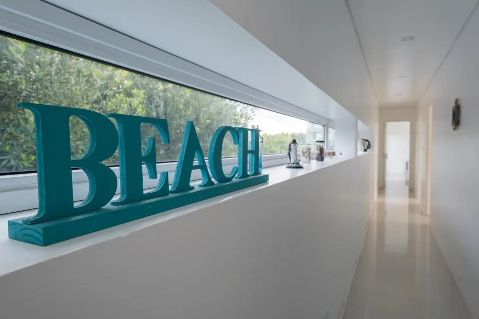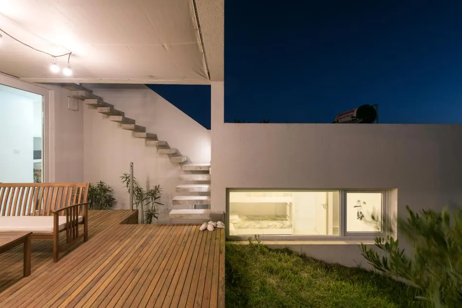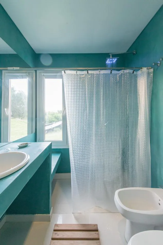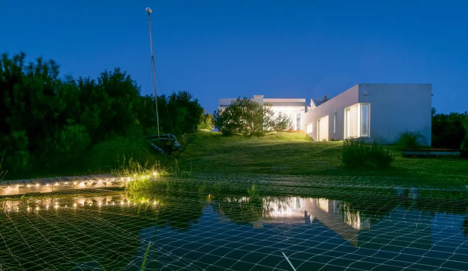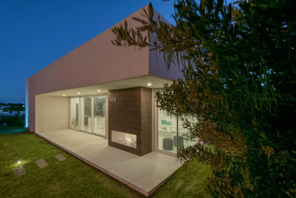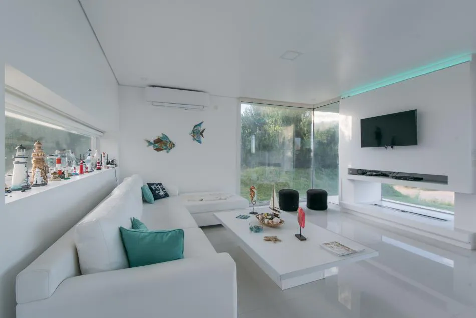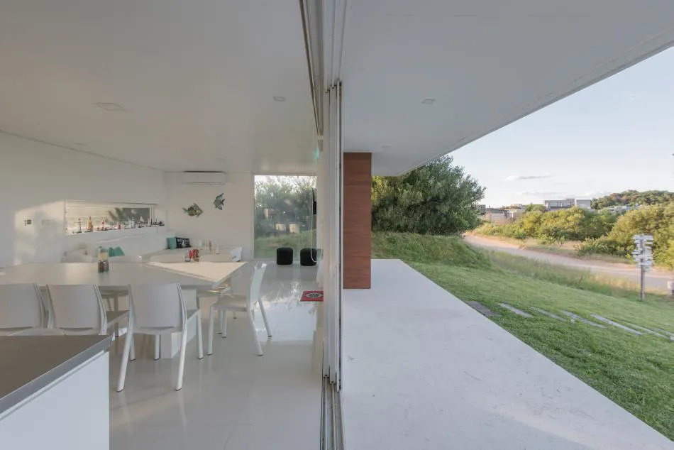 Pero el diálogo con el entorno no se reduce aquí a la permeabilidad o al estilo descontracturado y funcional del diseño; tiene en cuenta también lo social. En este sentido, con arreglo a los principios de los vecinos de Costa Esmeralda que promueven el cuidado y respeto por el medio ambiente, los arquitectos decidieron la adaptación de los volúmenes a la topografía del médano para minimizar la intervención; dotar a la vivienda de una pequeña galería en el frente que, junto a la trasera ya mentada, permite controlar los vientos dominantes y su temperatura gracias a la carpintería de PVC móvil; y nutrirla con energías alternativas a través de sus colectores solares. También se escogieron luces led que, además de ahorrar energía, permiten el cambio de ambientación con la variación de colores.