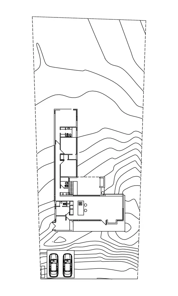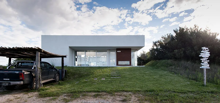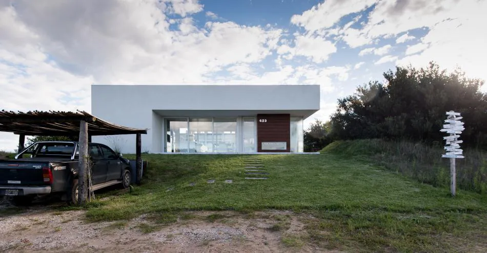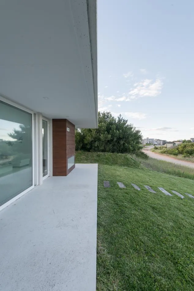 Precisamente siguiendo las ondulaciones naturales del médano en el que se asienta, se ha implantado esta vivienda de líneas netas, funcional y efectivizada en vidrio, hormigón y madera -materiales, diseño e ideas que constituyen el abc de la estética contemporánea, por lo que no es arriesgado decir que se vincula a ella-. Así, la casa de playa se desarrollará en distintos niveles pero en una sola planta, lo cual ha sido aprovechado para avalar una división de funciones.