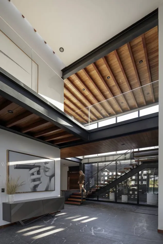 La volumetría del proyecto se percibe con mayor facilidad desde el exterior, sin embargo el interior de la casa juega con el mismo lenguaje. El ingreso peatonal se concibe a una altura moderada y se contrapone a la perspectiva exterior, que recibe al usuario con un cuerpo imponente recubierto de piedra, para después volver a enfrentarse a una doble altura que alberga las principales áreas sociales: la sala y el comedor.