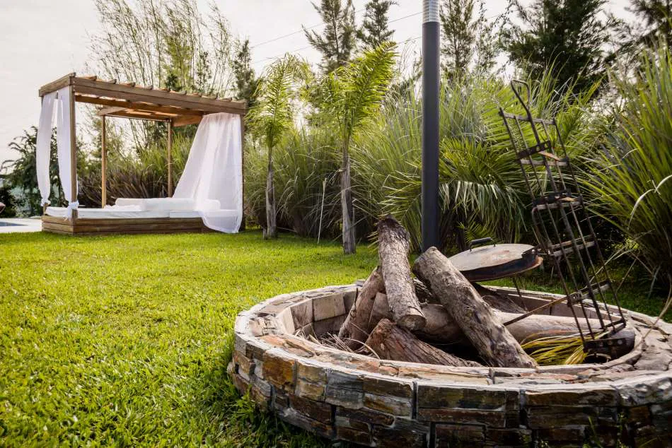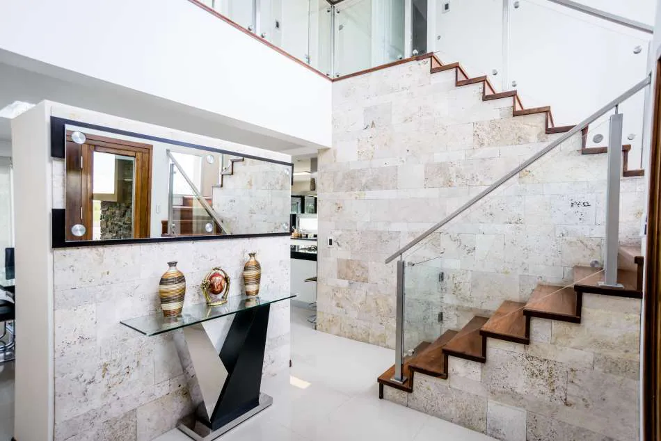 Los revestimientos en piedra, barandas y frente de parrilla en acero inoxidable son sólo algunos de los detalles que se destacan de la casa.