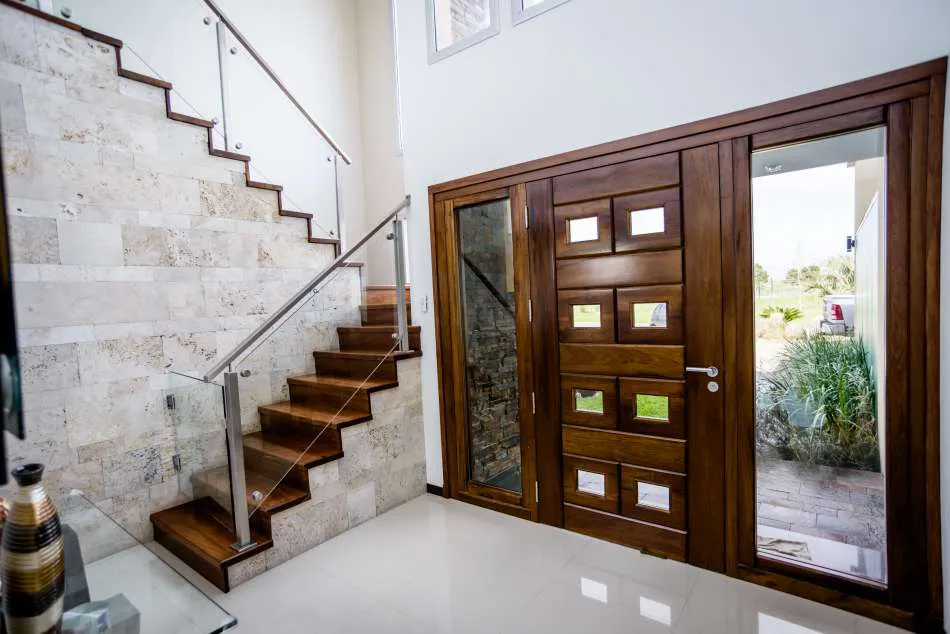 El garaje está cerrado en vidrio y plantado a la izquierda de la construcción; hacia el centro, se encuentra el acceso peatonal que comunica con el hall distribuidor en doble altura del que pende una araña de generosas proporciones traída por el propietario especialmente desde China.