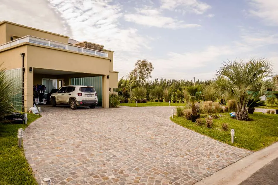 Guardando el retiro de calle consensuado, una rotonda de adoquines que insinúa un aire apenas francés refrendado por el techo y las barandas, conduce hacia el garaje apto para dos autos que, economizando espacio, corresponde a la terraza de la suite del piso superior.