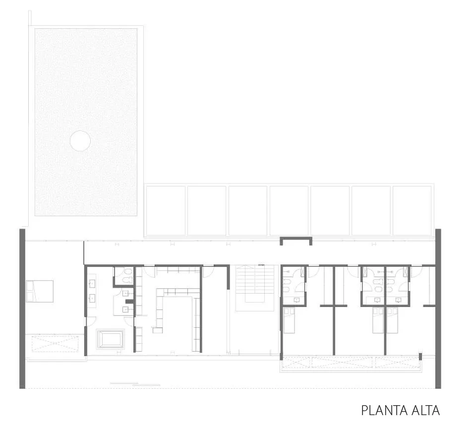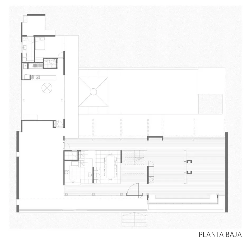El intersticio: Como leitmotiv de la vivienda se presenta el concepto de intersticios. En este sentido, la planta identifica claramente el adentro y el fuera pero juega con sus límites. Así, se otorgó espesor a los bordes y allí aparecen los espacios intersticiales. De esta manera, se creó un sistema que propone una progresiva transición entre interior y exterior. Esta decisión, al mismo tiempo que organizar la planta, mejora el rendimiento térmico. La superposición de capas, además, consolida la unidad de la casa y desdibuja el borde, dándole espesor.