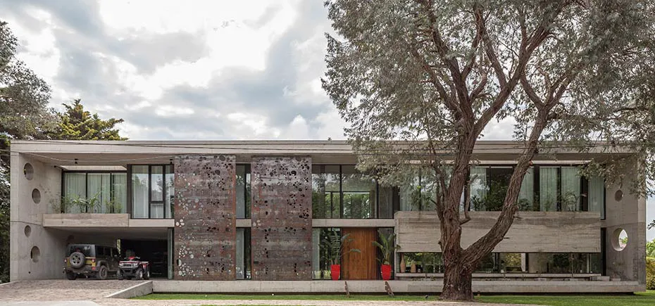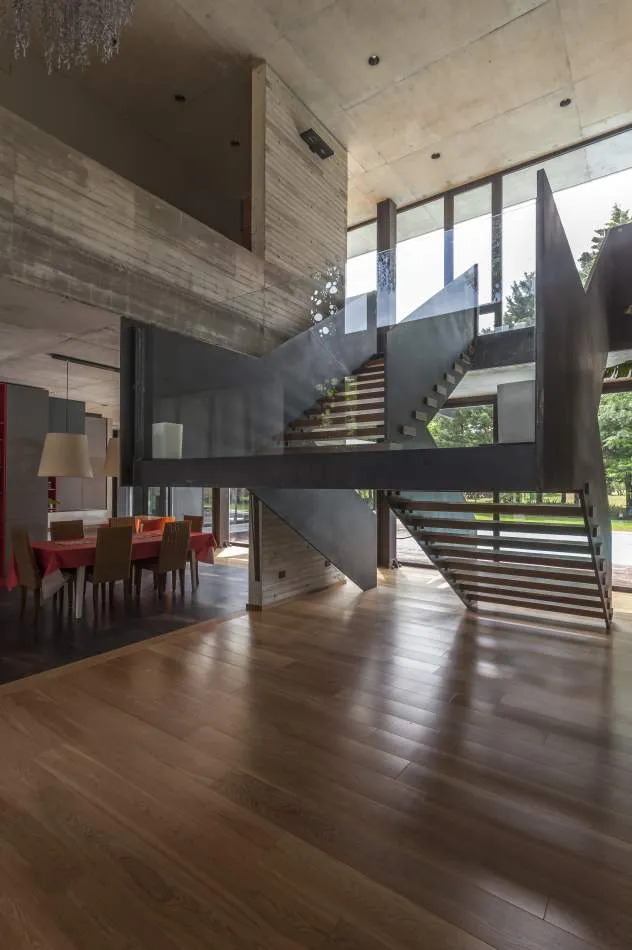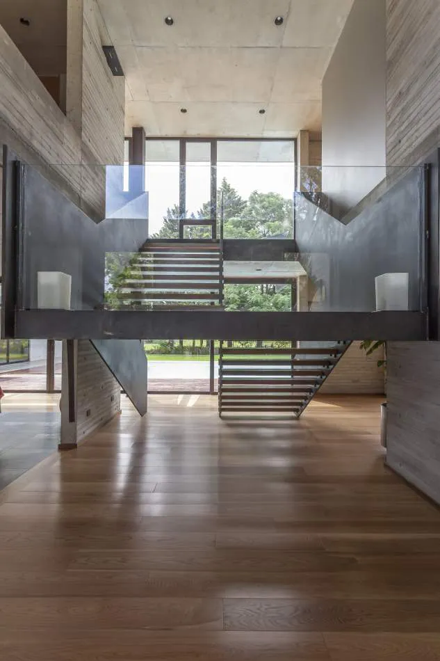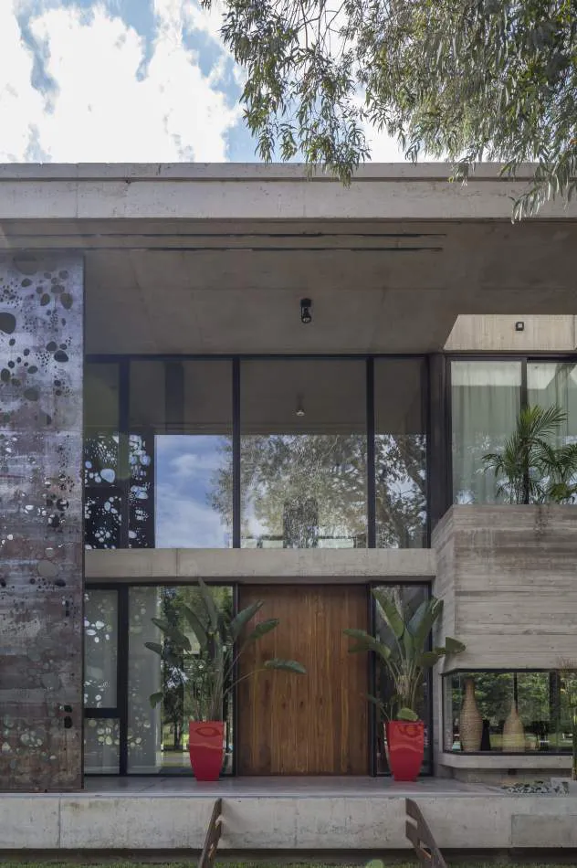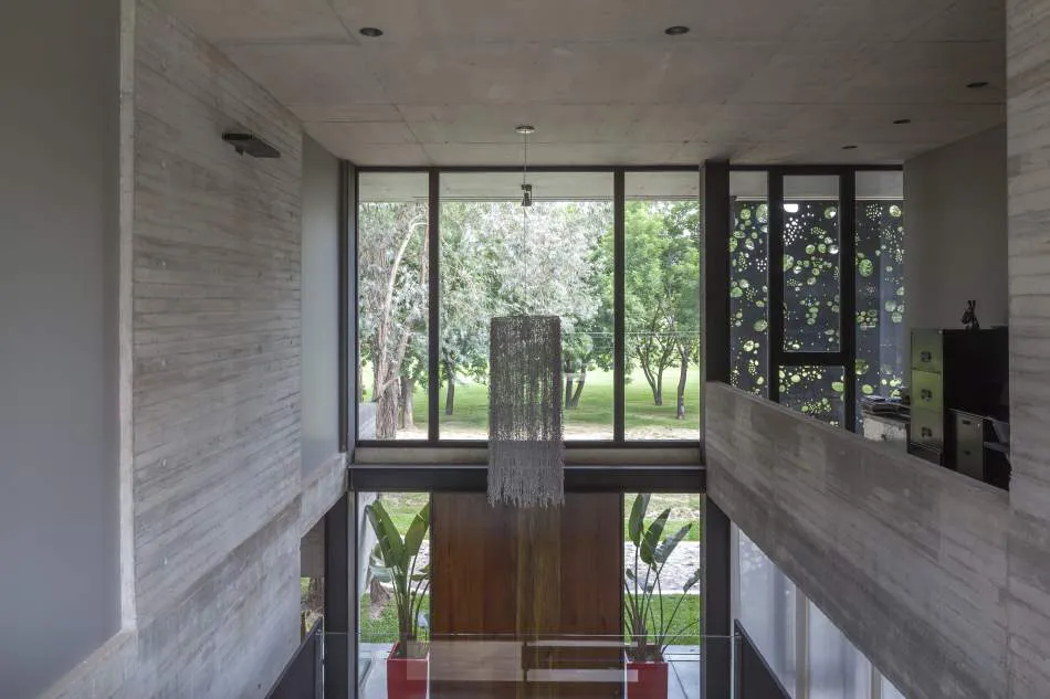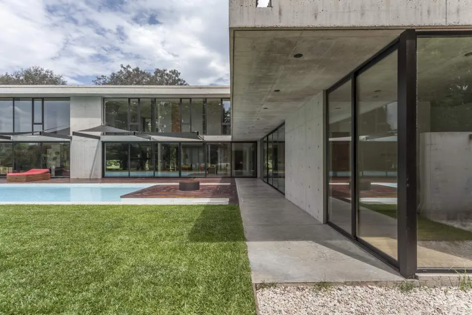 Expresión material: La casa explota la expresión del hormigón, el vidrio y el metal. Se exploró la plasticidad del hormigón proponiendo espacios de dobles alturas y de dimensiones características. El hormigón es quien ofrece la estructura general de la casa y los gestos principales. Con el vidrio y las plantas se terminan de definir los espacios y los volúmenes mientras que el acero relaciona todos los elementos, ofreciendo trabajos con un gran nivel de detalle.