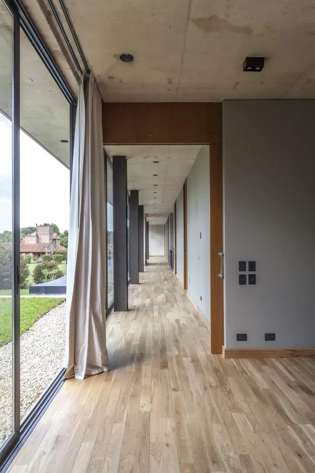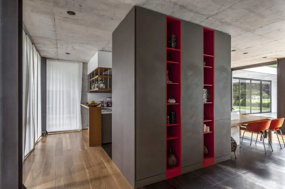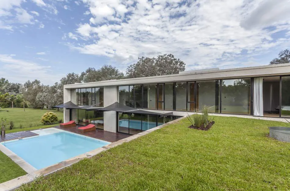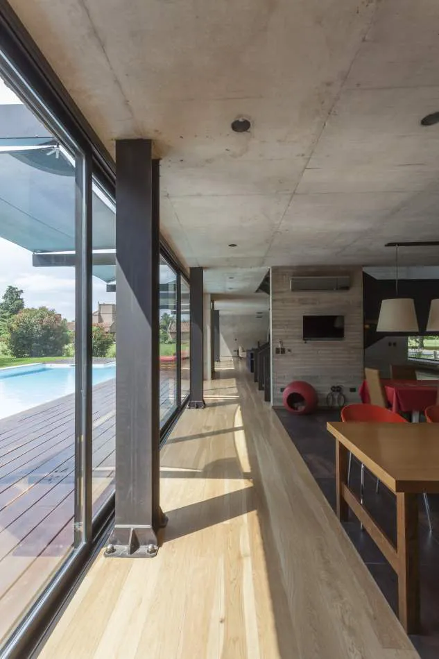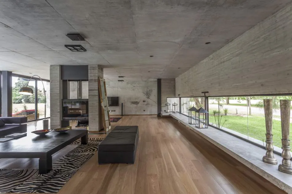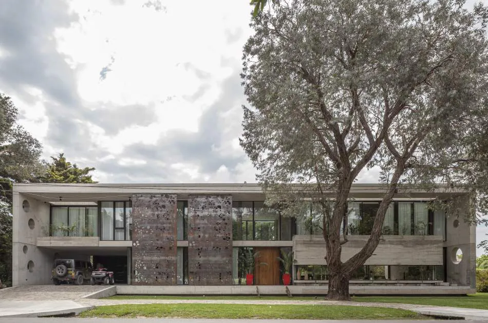 Expresión material: La casa explota la expresión del hormigón, el vidrio y el metal. Se exploró la plasticidad del hormigón proponiendo espacios de dobles alturas y de dimensiones características. El hormigón es quien ofrece la estructura general de la casa y los gestos principales. Con el vidrio y las plantas se terminan de definir los espacios y los volúmenes mientras que el acero relaciona todos los elementos, ofreciendo trabajos con un gran nivel de detalle.