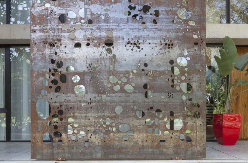 Tanto la escalera como los postigones corredizos de la fachada son chapas de acero mecanizadas digitalmente desde dibujos producidos por ordenador. Las herrerías y los ornamentos buscan entender los recursos de la industria contemporánea para ofrecer una estética con lenguaje moderno. La propuesta entonces fue desarrollar un lenguaje contemporáneo y situado.