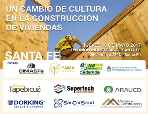 construcción y decoración, junto con CIMASFe (Cámara de Industriales Madereros y Afines de Santa Fe) – FAIMA (Federación Argentina de la Industria Maderera y Afines) y el Ministerio de Agroindustria - Presidencia de la Nación convocan a al seminario sobre Construcción con Madera y Diseño a realizarse el jueves 18 de mayo en la UNION INDUSTRIAL DE SANTA FE (25 de mayo 2843 - Santa Fe) – La entrada es libre y gratuita – con reserva y acreditación previa vía mail a [email protected].