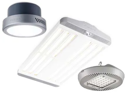 • Green Up LED Philips: apta para aplicaciones de uso interno y externo, en áreas industriales y comerciales, esta luminaria de tecnología LED ofrece una baja inversión inicial, excelente durabilidad y bajo consumo energético. Encendido instantáneo, alta eficiencia, luz neutra, durabilidad y robustez son sus principales características. Cuenta con una eficiencia lumínica de 125 lúmens / Watt.