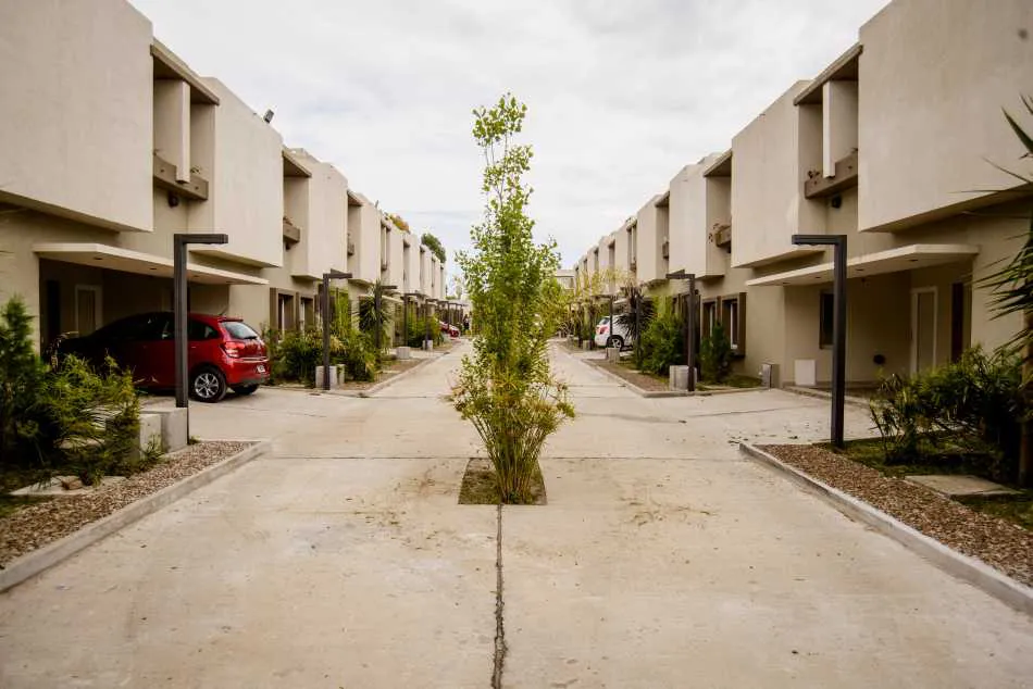 El fuelle verde que separa lo público de lo privado, aísla a las viviendas de cualquier ruido externo, marcando la transición entre ambos.