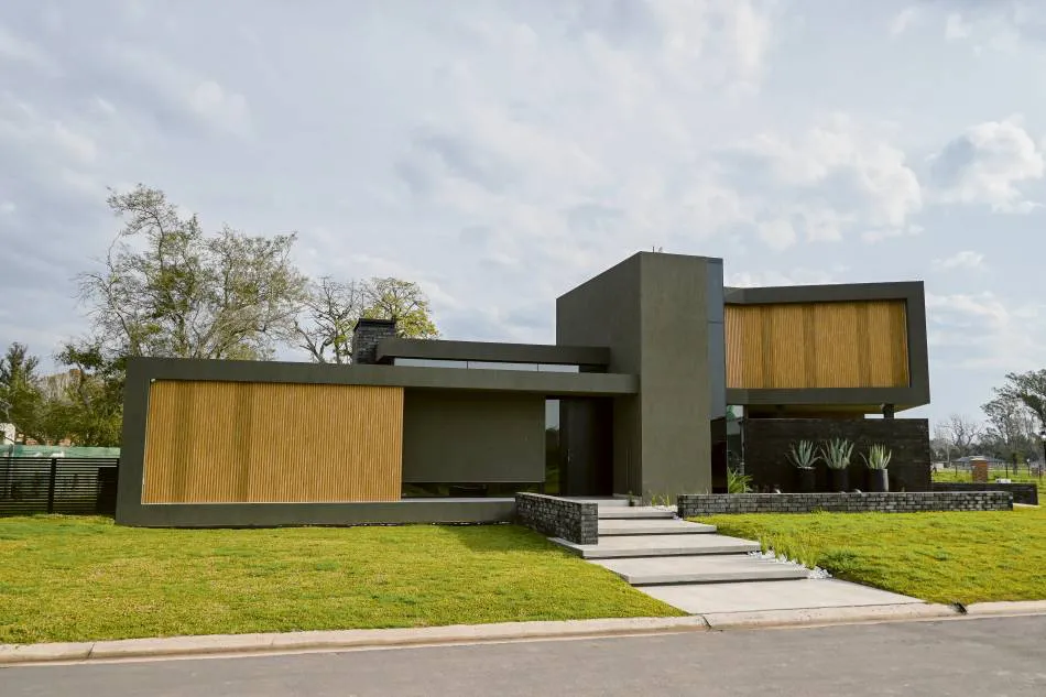 Ésta vivienda unifamiliar se construyó íntegramente con el sistema Steel Frame, lo que ofrece una flexibilidad excepcional para utilizar diversos materiales y aplicaciones. En este caso, se emplearon diferentes paletas de revestimientos como el Alucobond, las chapas símil madera y revestimientos elastoméricos de bajo mantenimiento y alta durabilidad.