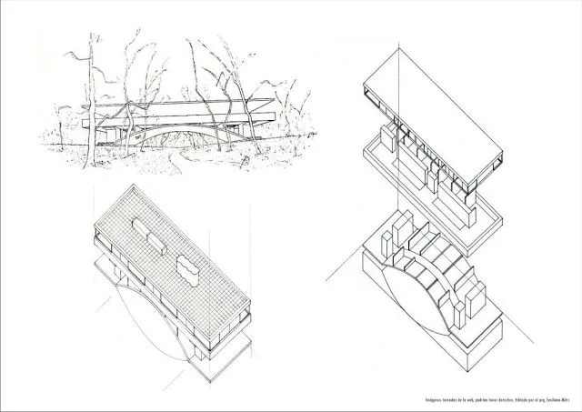 Morfológicamente, la Casa del Puente se presenta como un prisma transparente de 27 metros de largo, 9 de ancho y 4 de alto que se encuentra suspendido sobre una lámina curva delgada de hormigón; sobre los puntos de apoyo de este arco se ubican las entradas.