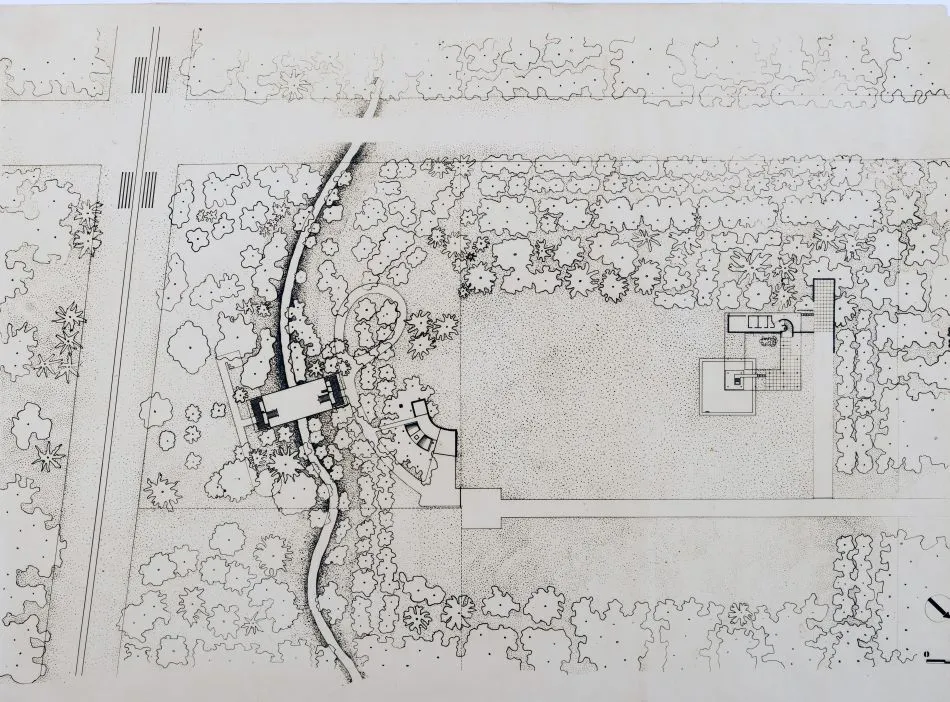 Las edificaciones que se construyeron (además de la vivienda se incluyó un pabellón de servicio/casa de huéspedes y garaje) se emplazan en un contexto excepcional, un terreno cruzado por la cuenca del arroyo Las Chacras, dividiéndolo en dos.