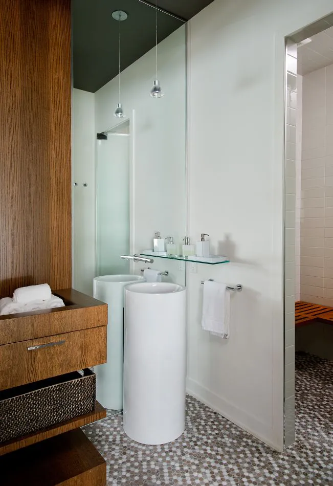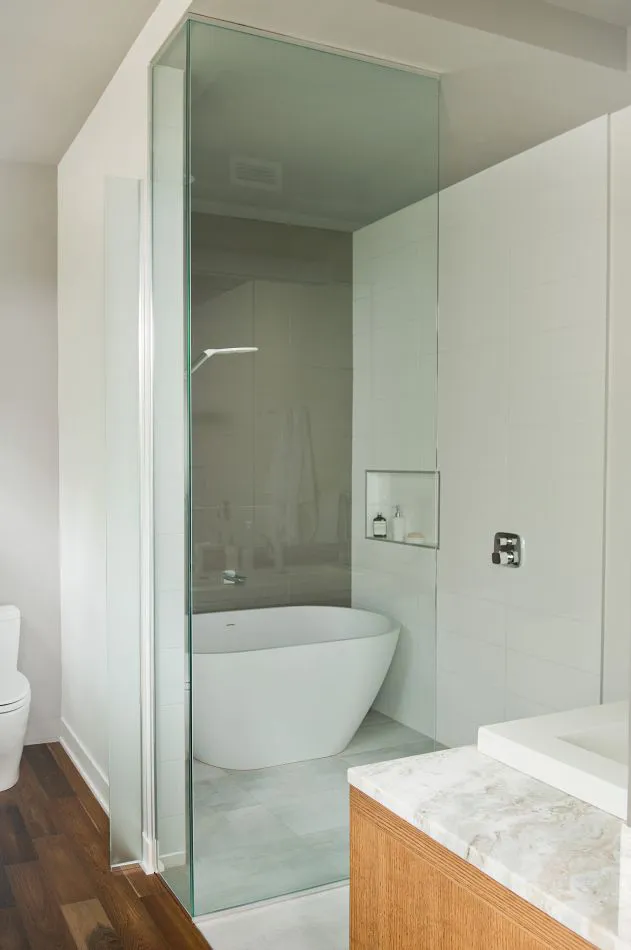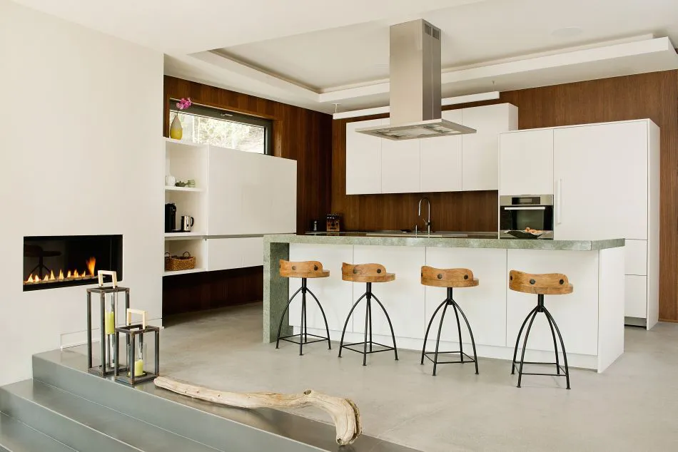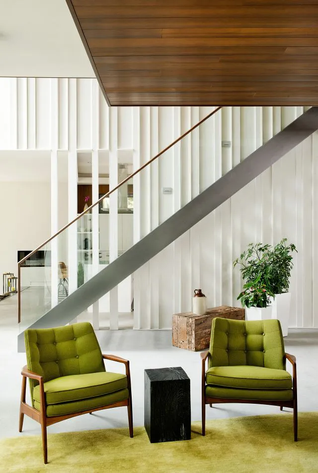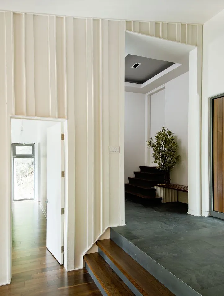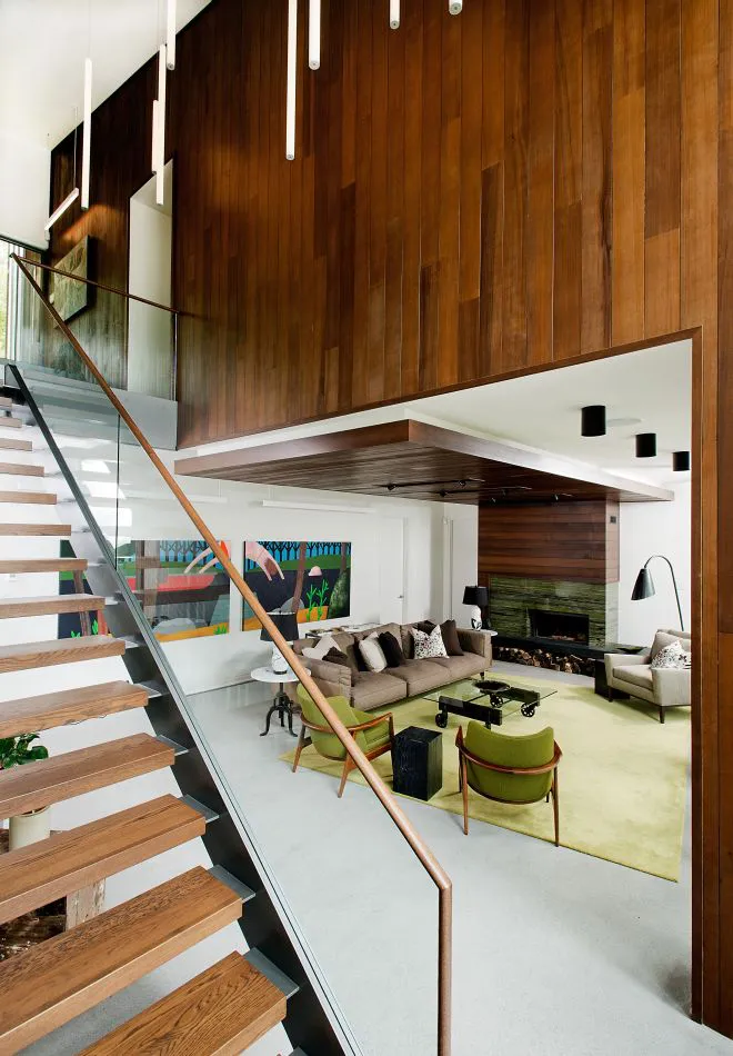 Las paredes que no están revestidas en madera son blancas, al igual que los cielorrasos, o han sido suplantadas por vidrios, sustitución que en función de la luminosidad que hace posible permite que la fuerte presencia de la madera –como en el caso de la sala de TV donde lo cubre absolutamente todo- no oscurezca en exceso los ambientes.