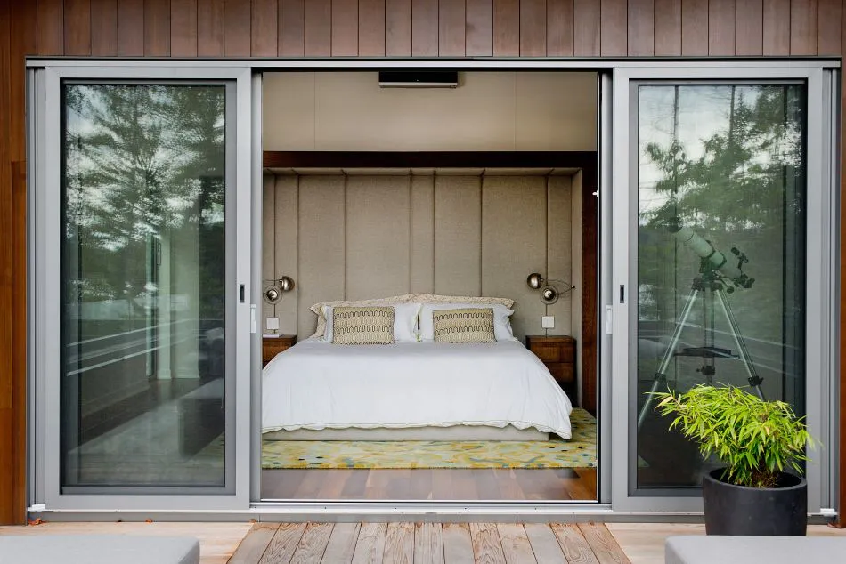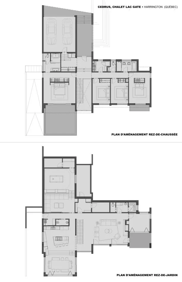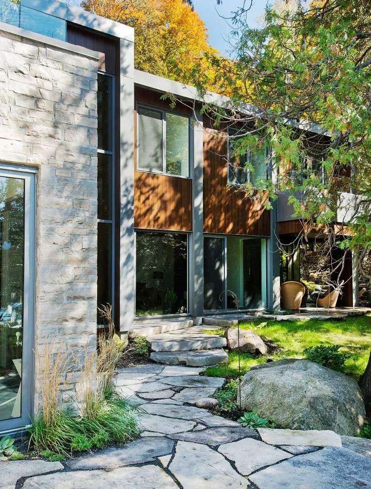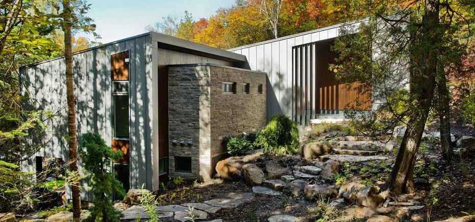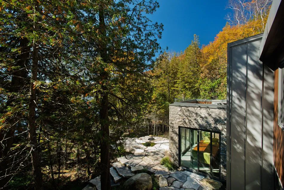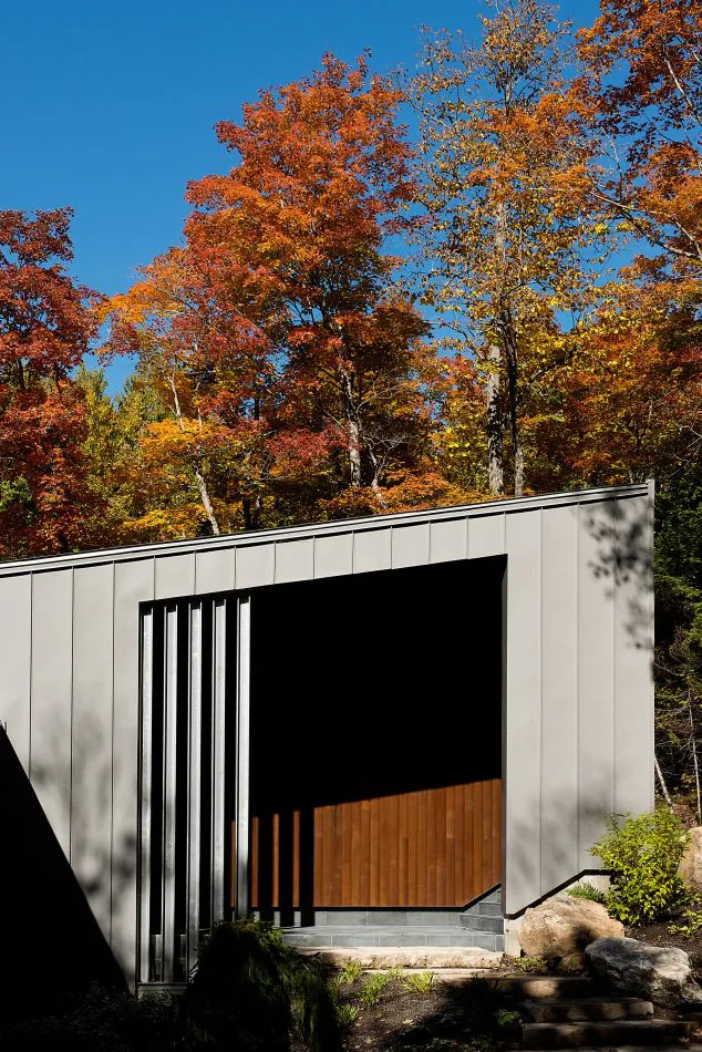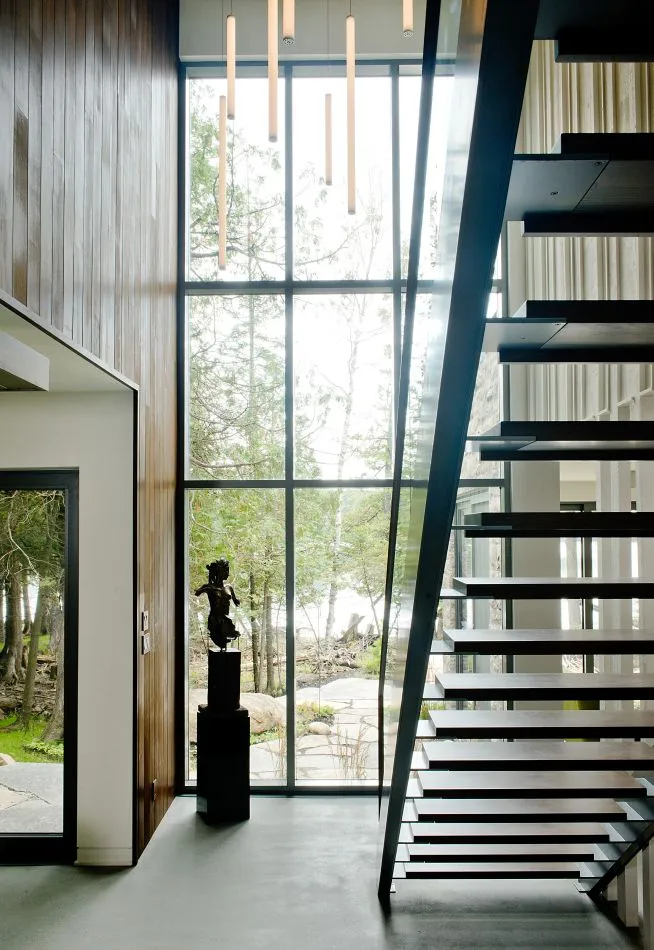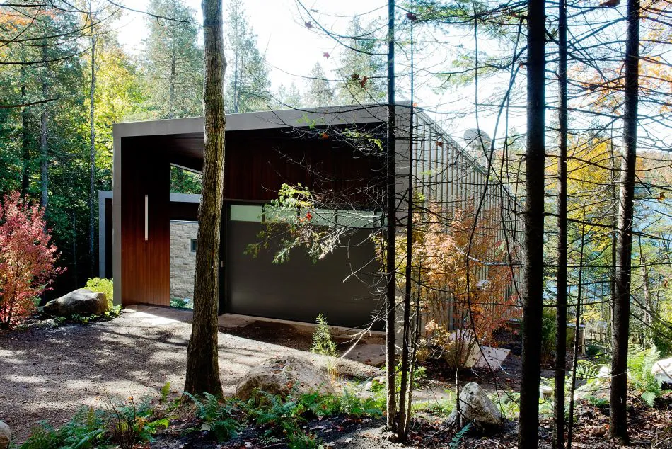 Harrington es un municipio de la región turística de Laurentides separado de Montreal por apenas 106 km. Es una zona arbolada y de lujosas viviendas. Allí, a orillas del lago Lake en un terreno de nada menos que 7600 m² se levanta esta vivienda cuya factura contemporánea -sabiamente combinada con rasgos que reenvían de la típica casa de campo- responde a un único imperativo: ofrecer a quienes la habitan las mejores vistas posibles de ese bosque de ensueño.