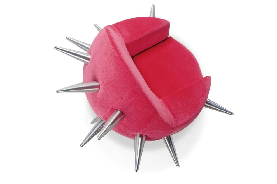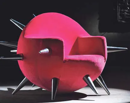 Simone Micheli es el autor de esta poltrona inusual y excentrica, que lleva elnombre Bomb, y es fabricada para la firma Adrenalina. Una estructura de maderay metal, acolchada con espuma de poliuretano y fibra de relleno.