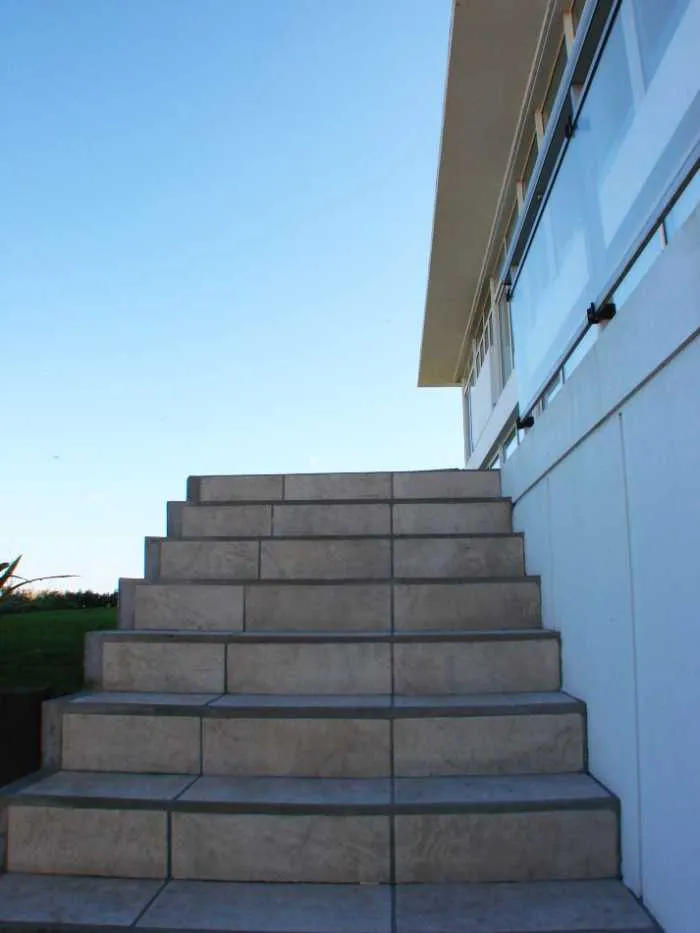Un camino en piedra rodeado de árboles y plantas sigue el desnivel que se produce desde la vía de acceso y conduce hacia la vivienda. Un amplio deck solarium antecede a la construcción, rodeando a la piscina y el jacuzzi. Desde allí, la casa se eleva rotunda y dominante, como un gran bloque longitudinal que se abre en una de sus caras y parece volar dentro del paisaje.