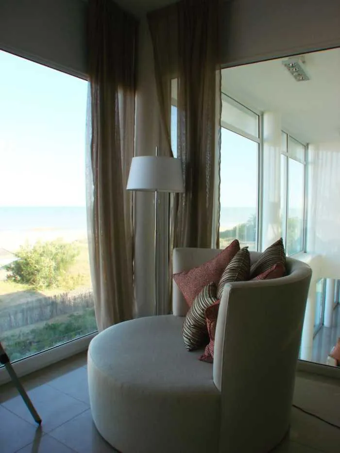 Una chimenea geométrica imprime carácter al conjunto en uno de sus extremosy parece desafiar el límite horizontal impuesto por la cubierta. En lafachada trasera, las ventanas recorren de arriba abajo los dos niveles, volcándose enteramente al mar. De esta forma, todos los ambientes principales ponen su mirada en el horizonte.