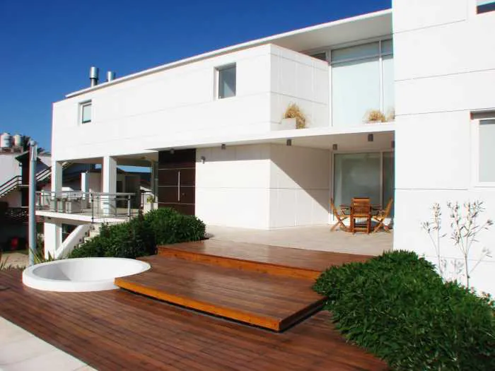 Una gran cubierta plana parece levitar sobre la casa, otorgándole liviandady esbeltez a esta sólida estructura. La construcción se destaca por sus múltiples balcones y terrazas, que se presentan como extensiones o incisiones del bloque central, todo caracterizado por un blanco dominante que es interrumpido por ligeros toques de madera en sus cerramientos y de elementos metálicos en barandas y aberturas.