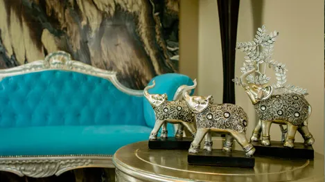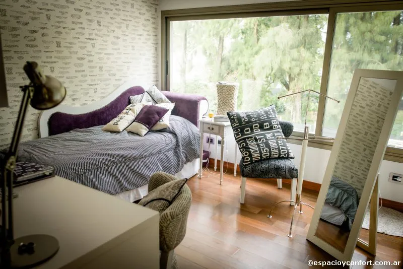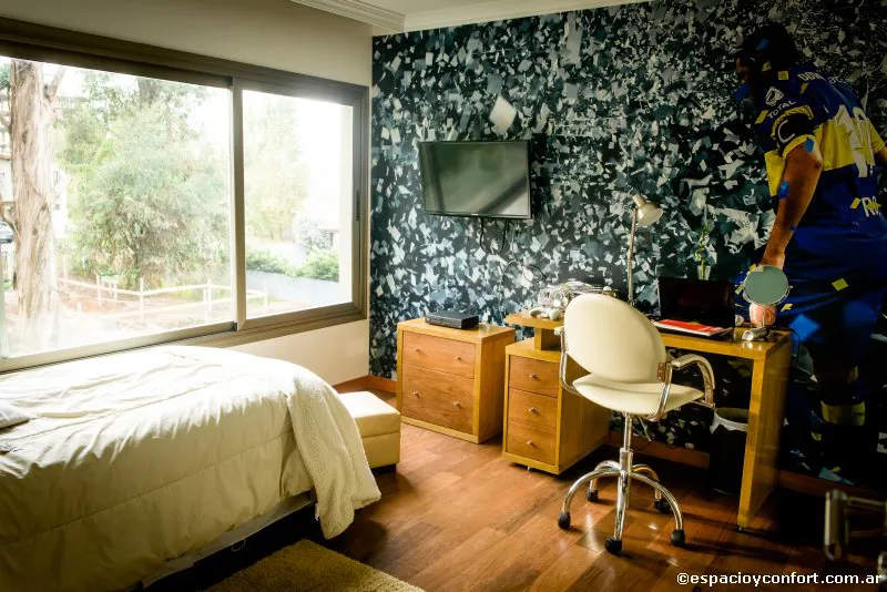 De esta amalgama son fruto rincones encantadores como el dominado por el sillón tipo Luis XV tapizado en turquesa tras el que puede verse una pared que es también una pintura abstracta, rincón complementado por una alfombra símil leopardo. También el estar en clave moderna con su mesa circular de tres bandejas y su gran sillón blanco sobre los que pende una fabulosa araña. La cocina y el comedor se resuelven asimismo al estilo de de los grandes diseñadores ya clásicos del siglo XX, mientras que las habitaciones guardan una relación tan estrecha con la naturaleza de sus ocupantes que puede atribuirse pertenencia a primera vista: por ejemplo la del varón ostenta en la pared la figura del jugador estrella de su cuadro de fútbol favorito; mientras que la de la hija adolescente lleva la pared empapelada con un motivo que reenvía a la escritura de los diarios íntimos. En cuanto a la suite, es imposible pasar por ella sin envidiar el fabuloso vestidor con mesa de tocador incorporada.