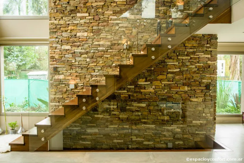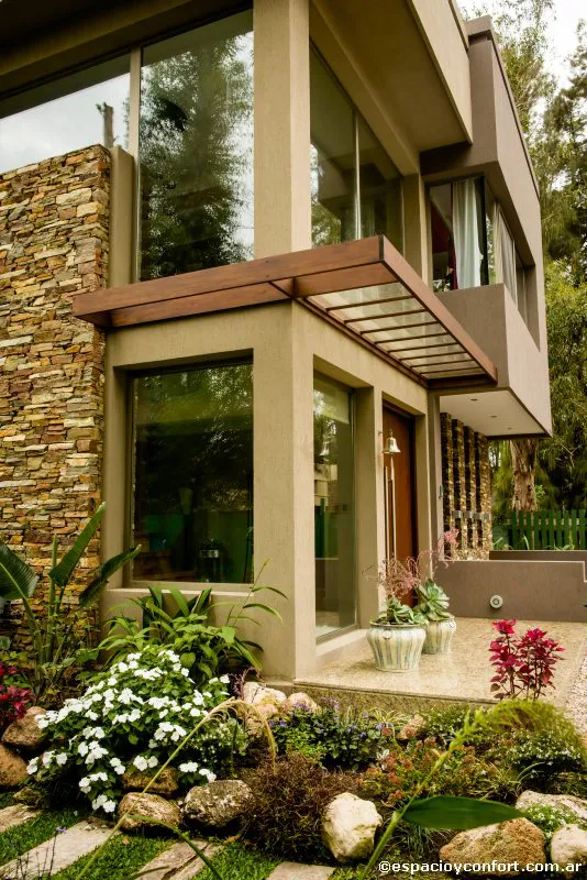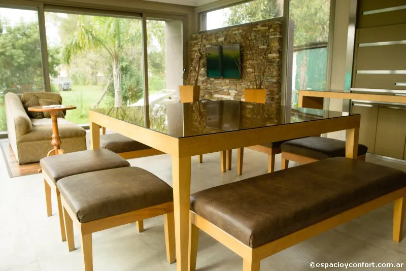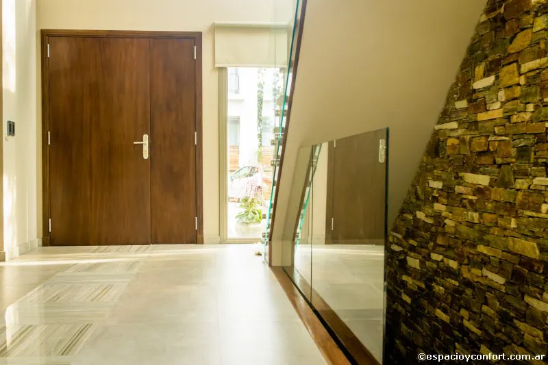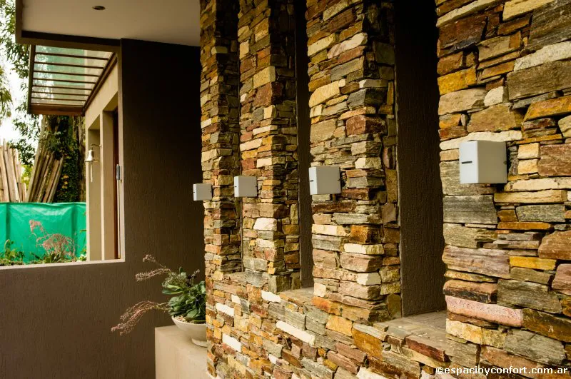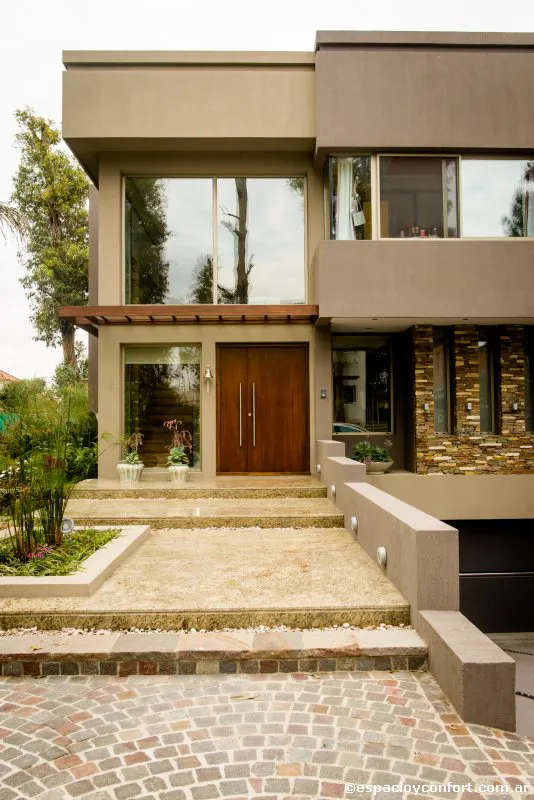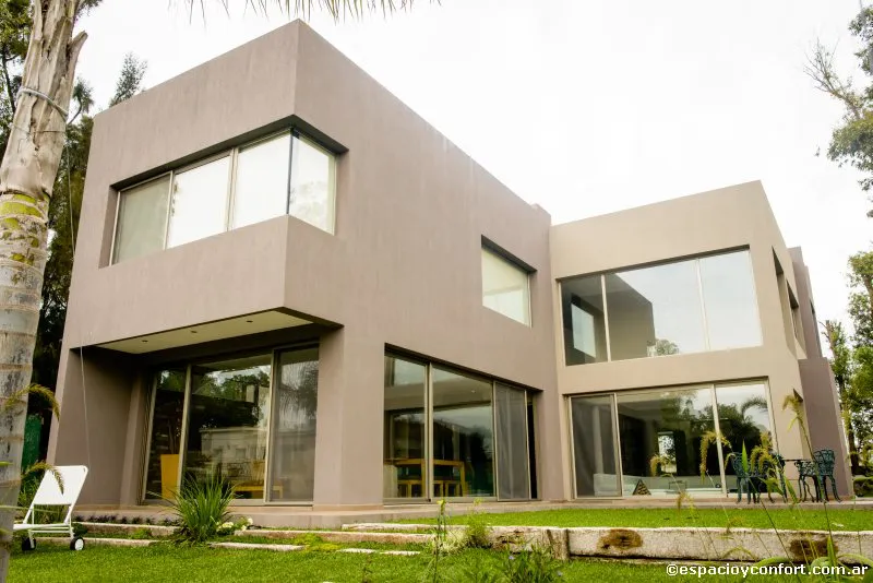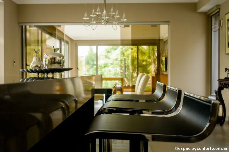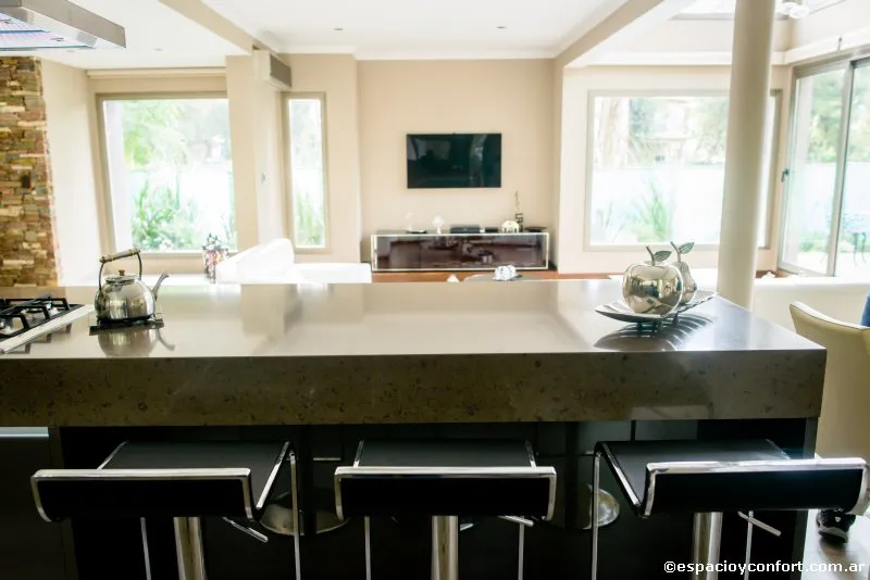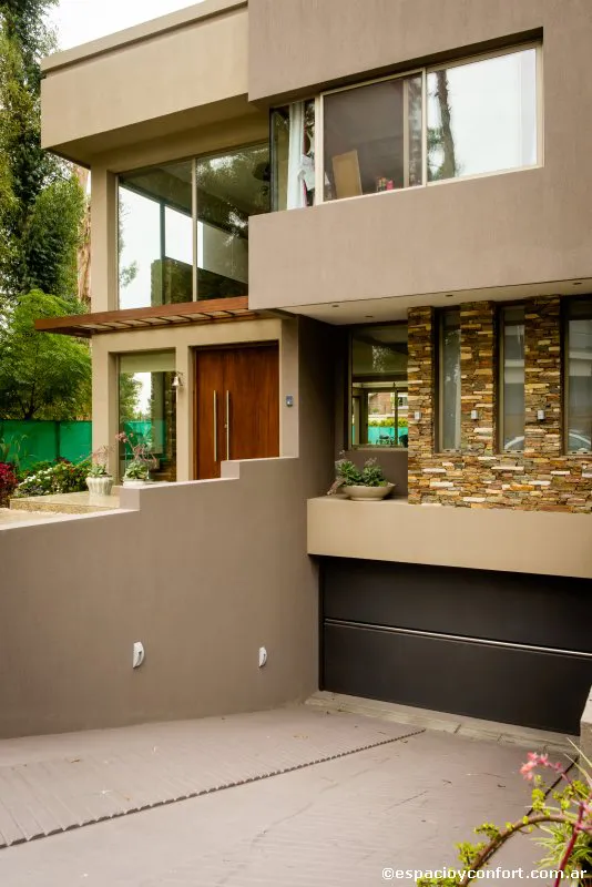 La sensación de amplitud es reforzada gracias a la total integración, funcionalidad y fluidez de los ambientes de la planta baja, integración que involucra no sólo al estar a doble altura, la cocina y el comedor, sino que alcanza incluso al quincho. En la propuesta estética de la arquitectura interior se buscó una clara síntesis entre materiales, colores y equipamiento. Al igual que en el exterior, la piedra domina algunas de las paredes creando interesantes sectores mientras el resto tiende a los beiges, reservando el blanco para los cielorrasos.