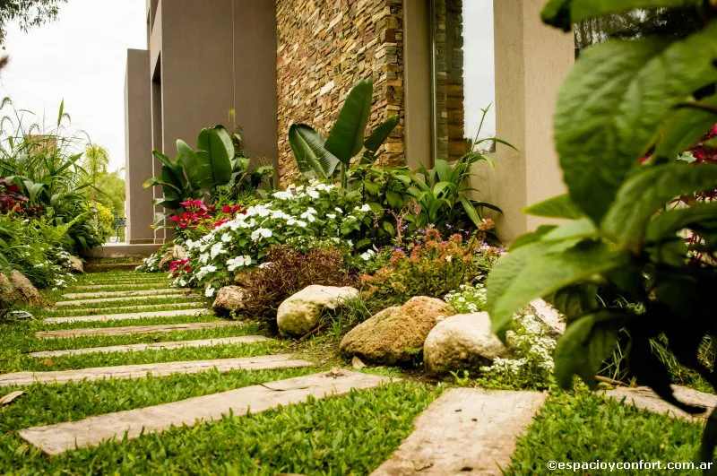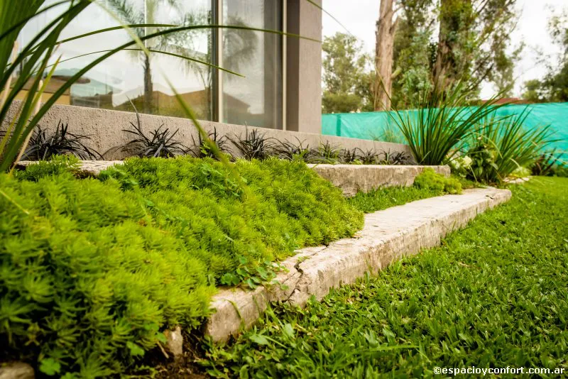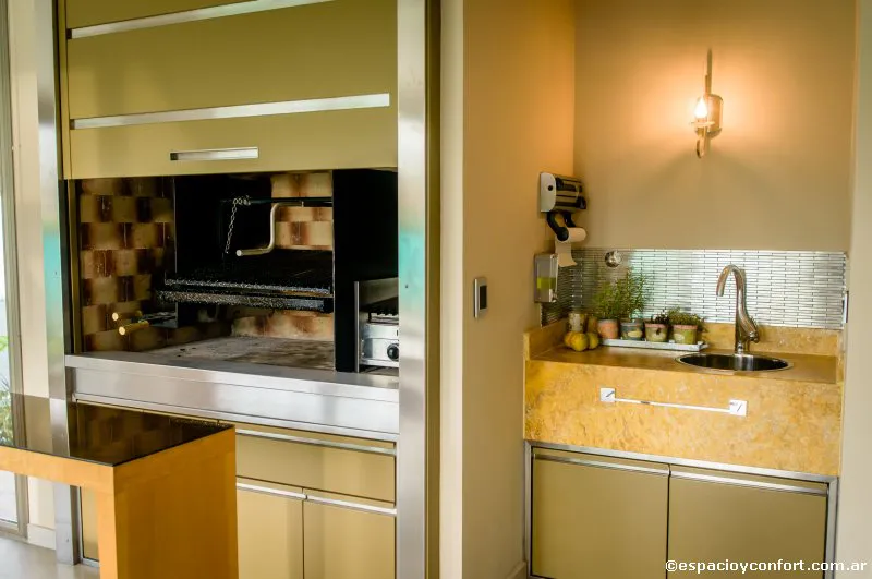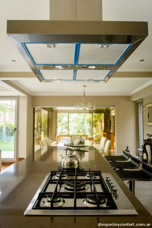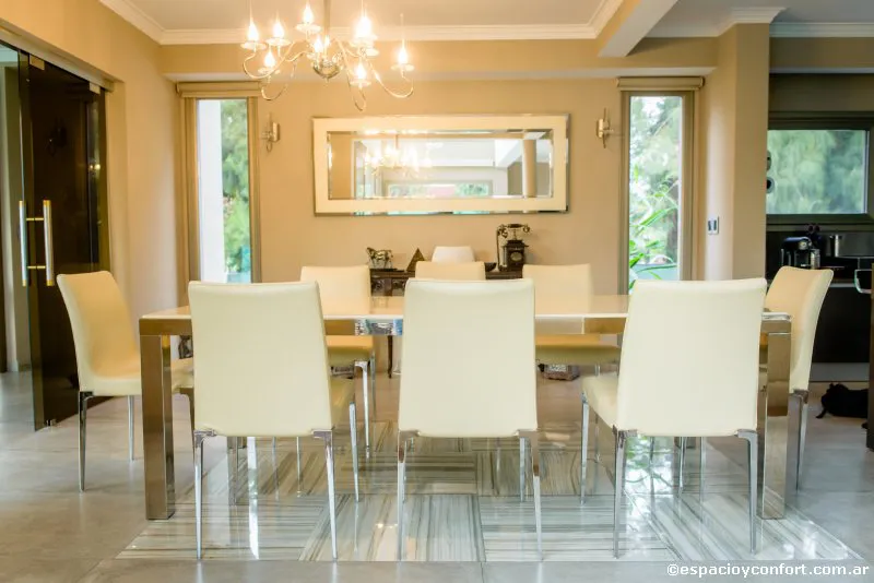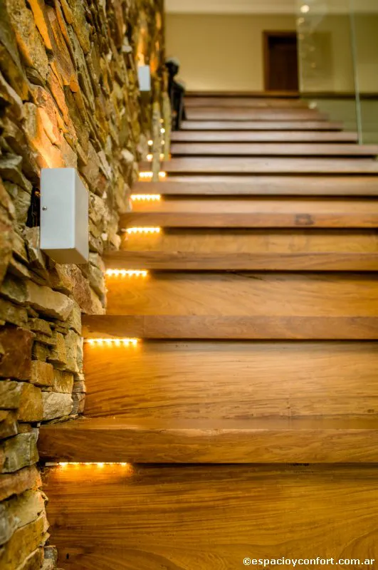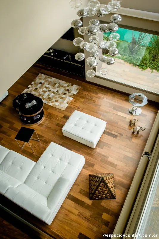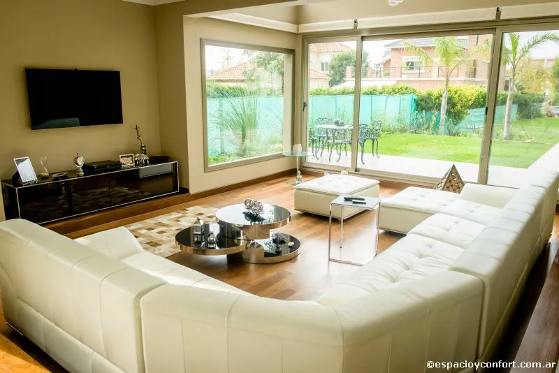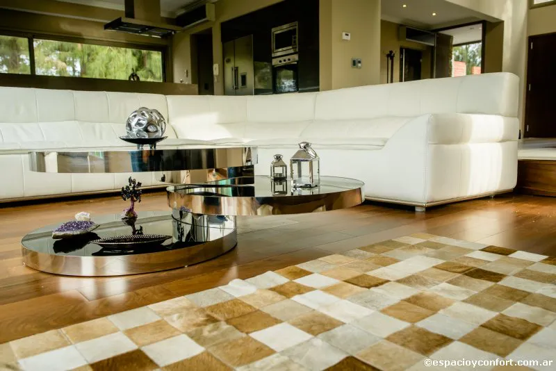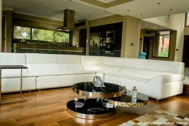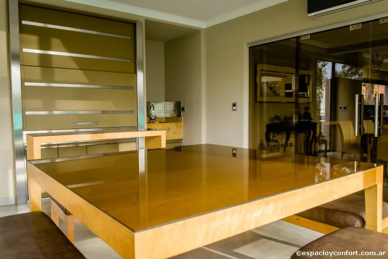 La sensación de amplitud es reforzada gracias a la total integración, funcionalidad y fluidez de los ambientes de la planta baja, integración que involucra no sólo al estar a doble altura, la cocina y el comedor, sino que alcanza incluso al quincho. En la propuesta estética de la arquitectura interior se buscó una clara síntesis entre materiales, colores y equipamiento. Al igual que en el exterior, la piedra domina algunas de las paredes creando interesantes sectores mientras el resto tiende a los beiges, reservando el blanco para los cielorrasos.