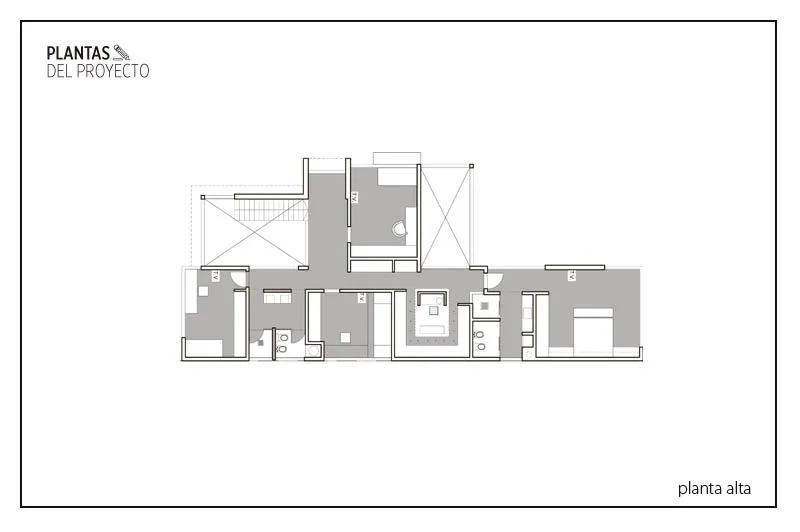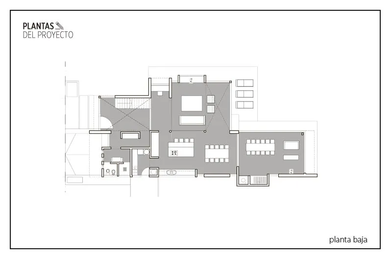 Con estos fines en mente, se decidió trazar una casa en forma de “L” que contara con un subsuelo y dos plantas. En el subsuelo se dispuso el garaje y el cuarto de máquinas; en la planta baja las áreas sociales, y en la alta las habitaciones.