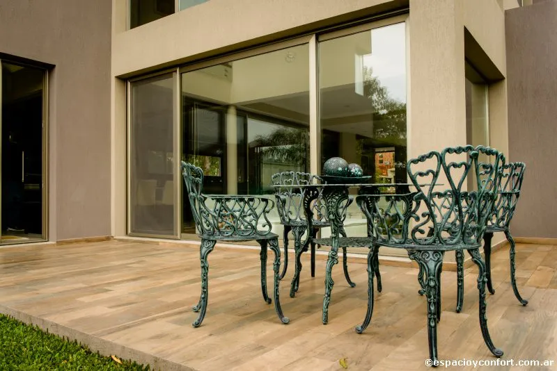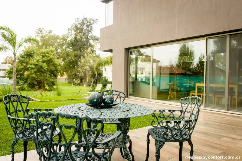 La contrafachada es aún más abierta que la fachada, y la pérgola de madera que sitúa la entrada principal en el frente encuentra su contrapartida en una galería cubierta hacia el fondo que expande las áreas sociales planteando una suave transición con el parque.