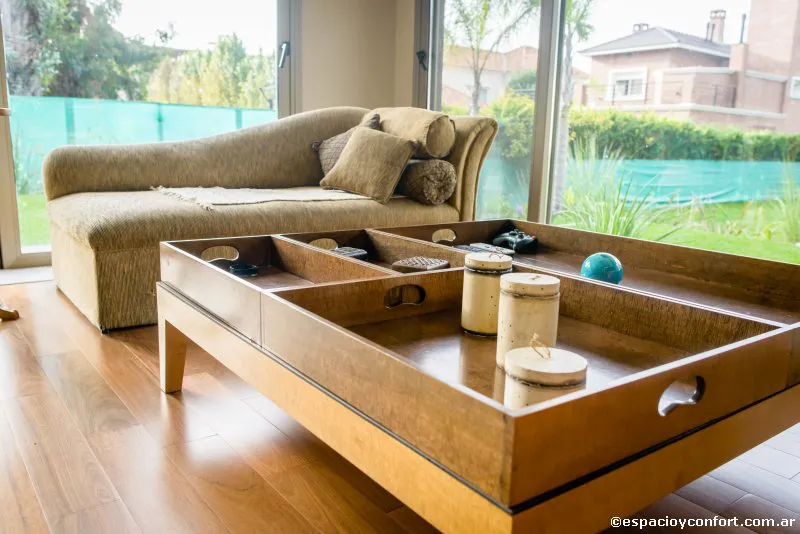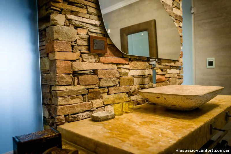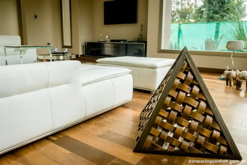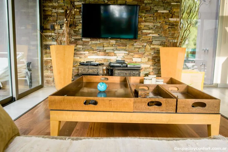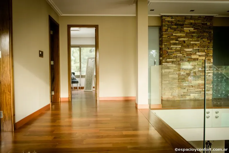 Los pisos de porcelanato italiano se dirimen en la misma paleta de colores. En algunas áreas (como el estar) se alternan con la madera con el mismo cometido que los revestimientos de piedra: sectorizar sin recurrir a muros ni puertas que atentarían contra el buscado efecto de continuidad espacial.