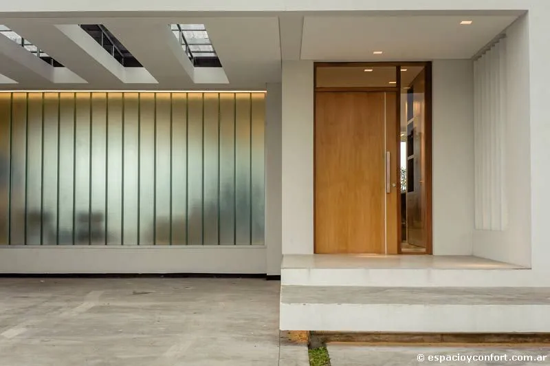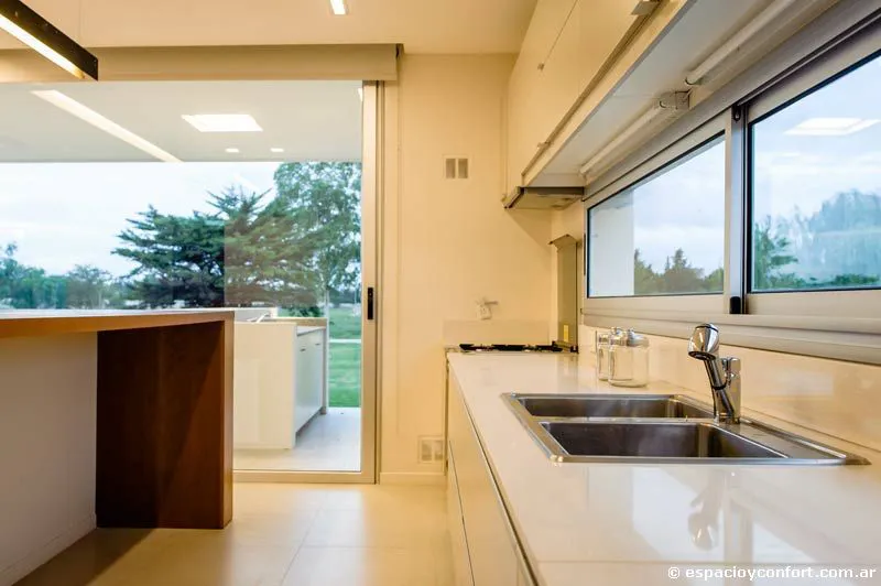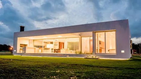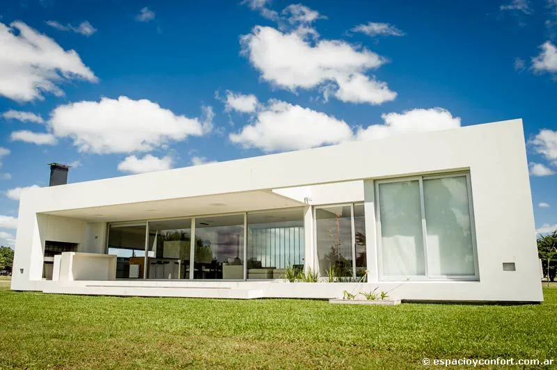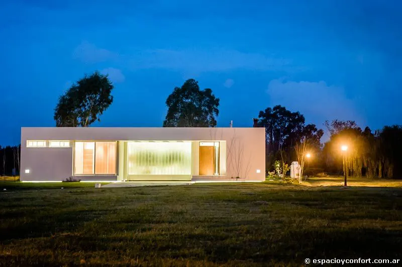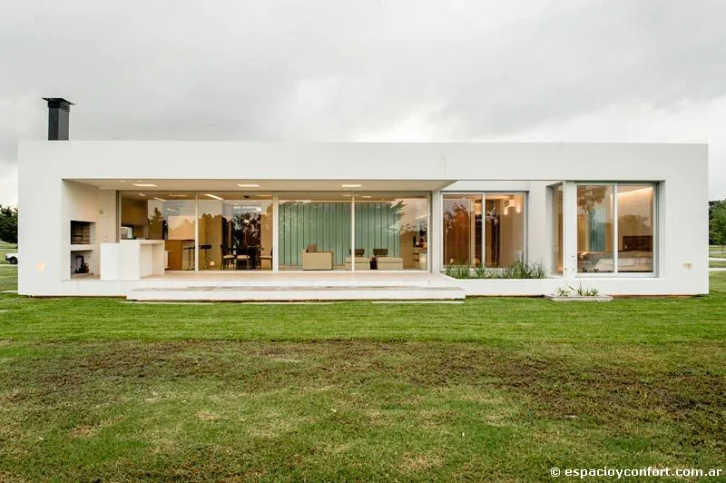 La casa ocupa un lote en el barrio cerrado Lomas de City Bell, un emprendimiento cuyo diseño urbanístico estipula que los fondos de cada unidad habitacional converjan en un espacio verde común de 20 metros que distancia su parque interior del vecino. Así, a un frente en el que los grandes planos acristalados ostentan texturas que, aunque permiten el paso de la luz, estorban la mirada del paseante, corresponde un contrafrente dominado casi por completo por un vidrio transparente que expande los ambientes hacia el verde, favoreciendo las vistas y planteando una privacidad descontracturada más que deseable. Tal expansión se materializa por medio de un amplio espacio semicubierto intermedio (55 m²), que da cuenta de que el diálogo fluido con el entorno no es una premisa de moda defendida sólo por conveniencia. En cuanto a la distribución, la planta única horizontal aloja en un orden inteligente y claro la disposición vertical de los ambientes con arreglo a sus funciones. Son tres módulos flexibles y comunicados. El área social conformada por el estar-comedor integrado y la mencionada galería semicubierta apta para reuniones y encuentros, constituye el módulo central; a su izquierda se ubica el eje de servicio compuesto por cocina, lavadero, tender y parrilla que sirve de apoyo; a su derecha se halla el ala destinada a los dormitorios (uno principal con vestidor y dos comunes) y a los baños. Un hall distribuidor que nace en la entrada principal vincula horizontalmente los tres módulos.