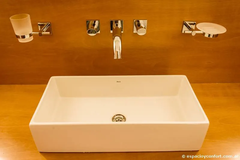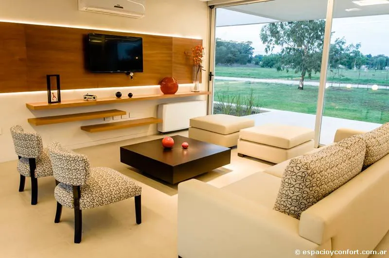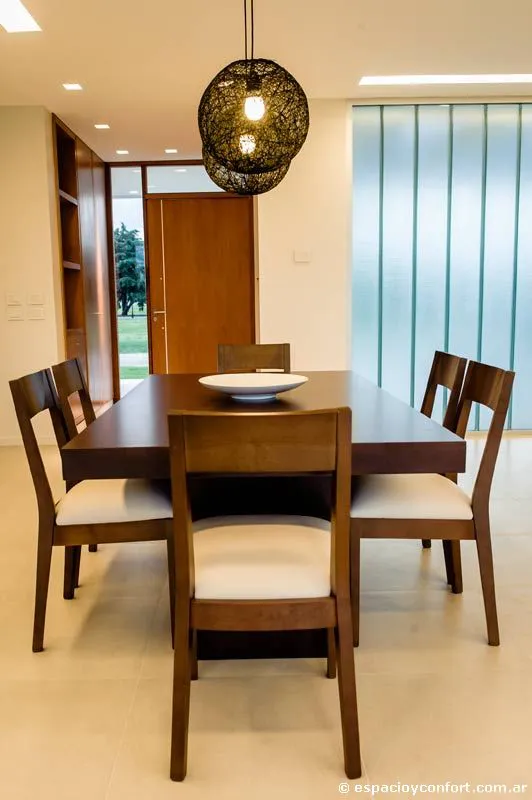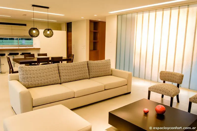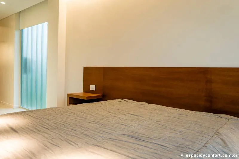 Por otra parte la cocina apenas se halla divida del comedor por la barra desayunadora. Por fuera la casa es una caja de aristas blancas y lados de cristal interrumpidos por la madera de la puerta y la carpintería de aluminio; por dentro la misma blancura –dominante en los pisos de porcelanato, en las paredes y cielorrasos- refuerza una espacialidad generosa. En ella, elecciones que son menos decorativas que resultados de una concepción holística de la obra, llevan a que el arquitecto escoja con consistencia y amoroso cuidado un mobiliario de líneas simples capaz de imprimir, sin atiborrar los ambientes, una calidez que nace de la armónica conjunción de su estilo, su materialidad y el de la estructura que lo contiene. Así, aunque la coherencia del rasgo parezca excesiva, los distintos tonos de madera que cortan la blancura del espacio parecen recalcar con su variación la consigna funcional que subyace a la vivienda: clara como la de las puertas y sus marcos es la madera de los “muebles” de guardado, exhibición o uso que, inamovibles, se adhieren u horadan las paredes de las estancias a las que están destinados a brindar confort formando parte de ellas. En esta clase compiten en austeridad y elegancia, por ejemplo, el multifunción del estar, el del cuarto, el respaldo muñido de mesas de luz de la cama y las mesadas de los baños. Una madera más oscura se reserva para la mesa baja del estar y las sillas que la acompañan o para el juego de comedor. Por lo demás, el off-white señorea el tapizado de sillones y sillas, los cubrecamas, las modernas bachas y sanitarios, y la totalidad del amoblamiento de la cocina revestido de práctica melamina. La suave iluminación completa la atmósfera acogedora. Una atmósfera que vuelve único la práctica uniformidad de lo moderno.