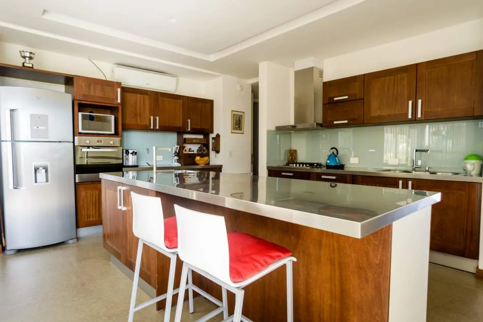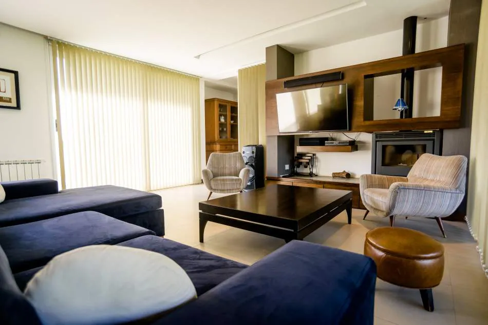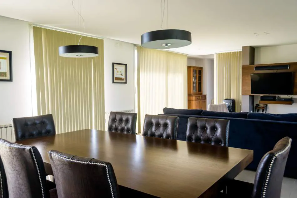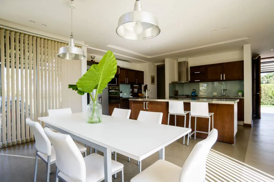 En cuanto a la decoración, hay que decir que no ha descuidado las diferentes funciones de cada bloque y que ha contribuido a respaldar la idea de fusión entre lo campestre y lo contemporáneo. Así, sobre los pisos de porcelanato claro que unifican todas las áreas sociales –incluyendo las exteriores como la galería- se luce un mobiliario que aúna cierta impronta señorial, como la de las sillas que rodean a la mesa del comedor o los sillones individuales del estar, con lo moderno. Dentro de lo moderno se encuentran todas las lámparas, el sofá y el taburete del estar, por lo menos.