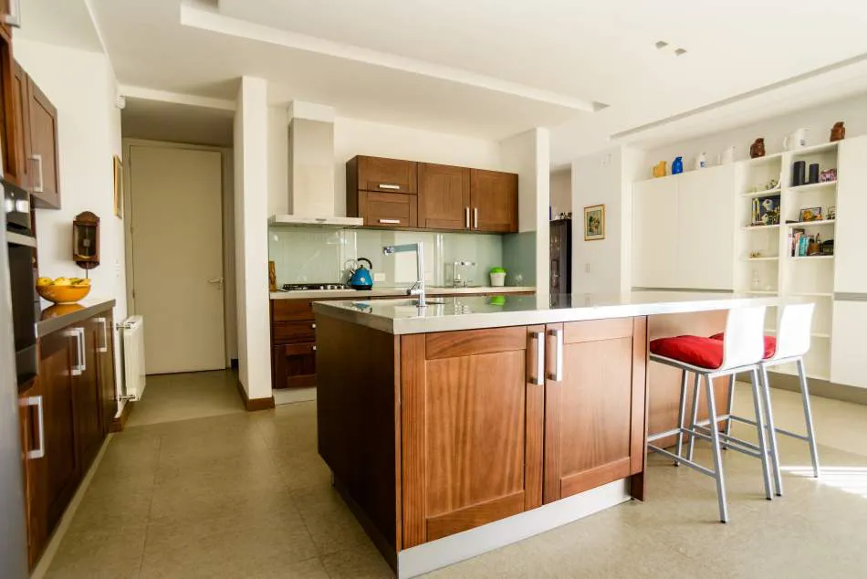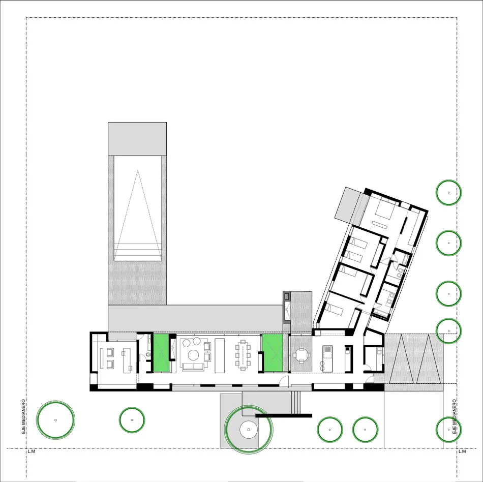 El corolario del mentado volumen es la cocina. La cocina articula la unión con el segundo volumen, planteado de forma perpendicular con una pequeña inclinación de 20 grados.