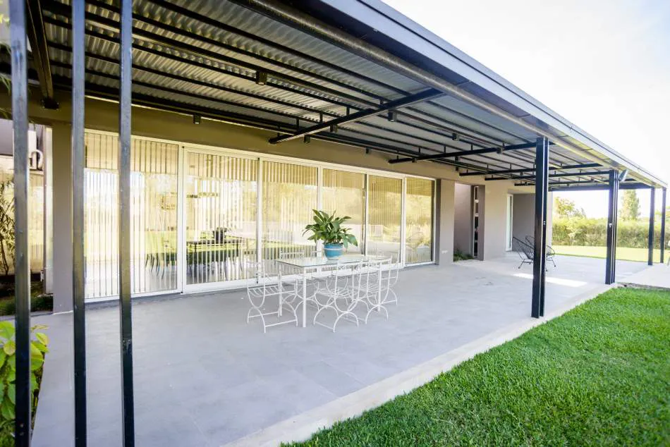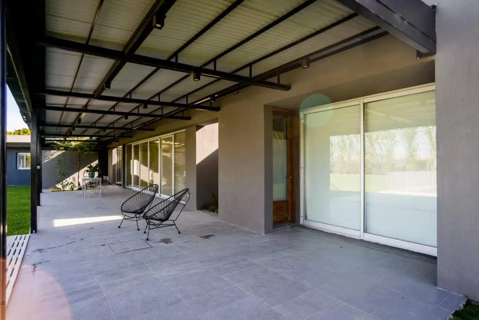 No se puede obviar la galería extra large que en lugar de cerrar, abre el contrafrente al parque extendiendo las estancias interiores. La galería, además, se transforma en uno de sus extremos en el deck que oficia como expediente para unir la piscina al conjunto de la construcción.