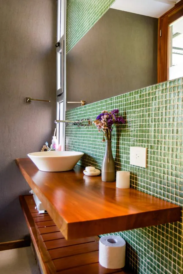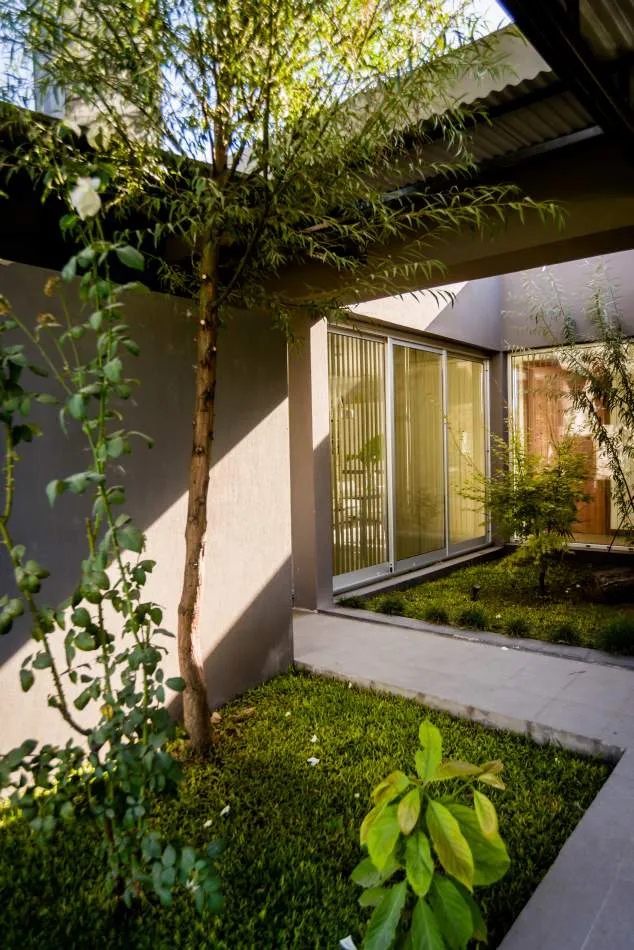 A diferencia de los paños vidriados que “cierran” los ambientes sociales, se pensaron para el área ventanas chicas con el fin de resguardar la intimidad. Los baños y el lavadero se hallan ubicados hacia el lateral sur del lote, en la cara opuesta al segmento de parque que contiene la piscina.