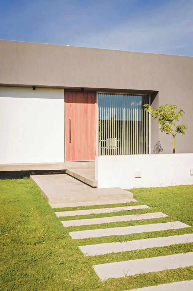 El primer volumen, el puro, es el que se halla –guardando el retiro típico del barrio- paralelo a la calle y el que muestra más semejanzas con las precedentes creaciones del estudio. La casi imperceptible elevación del terreno se replica en una elevación del bloque y de la entrada principal a la que conducen los durmientes de concreto.