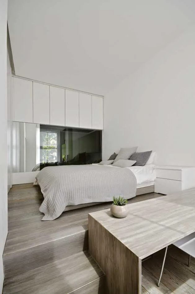 La amorosa solicitud del arquitecto para con sus clientes se ve en los detalles, por ejemplo: el podio sobre el que la cama matrimonial se alza proporciona –más allá de los ya mencionados- espacios de guardado tan insospechables como los que licencia el pasillo.