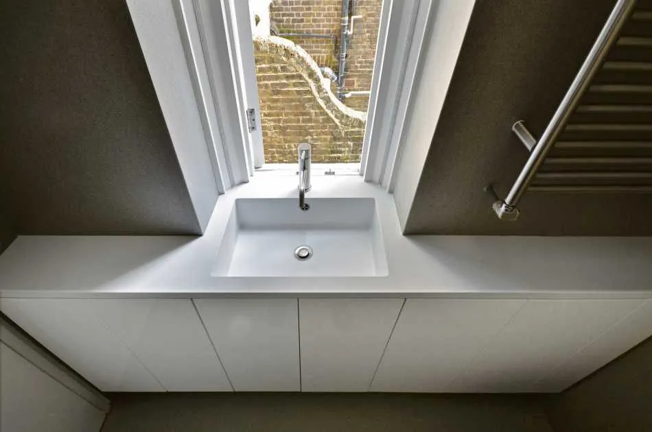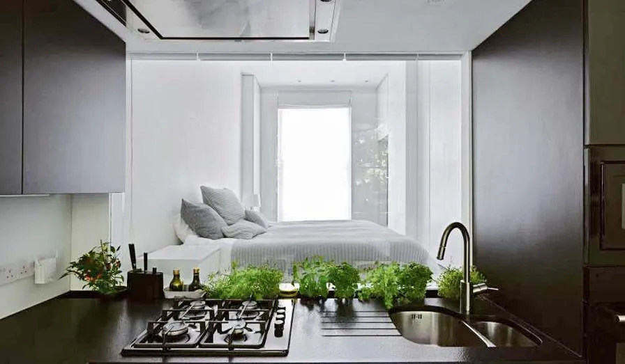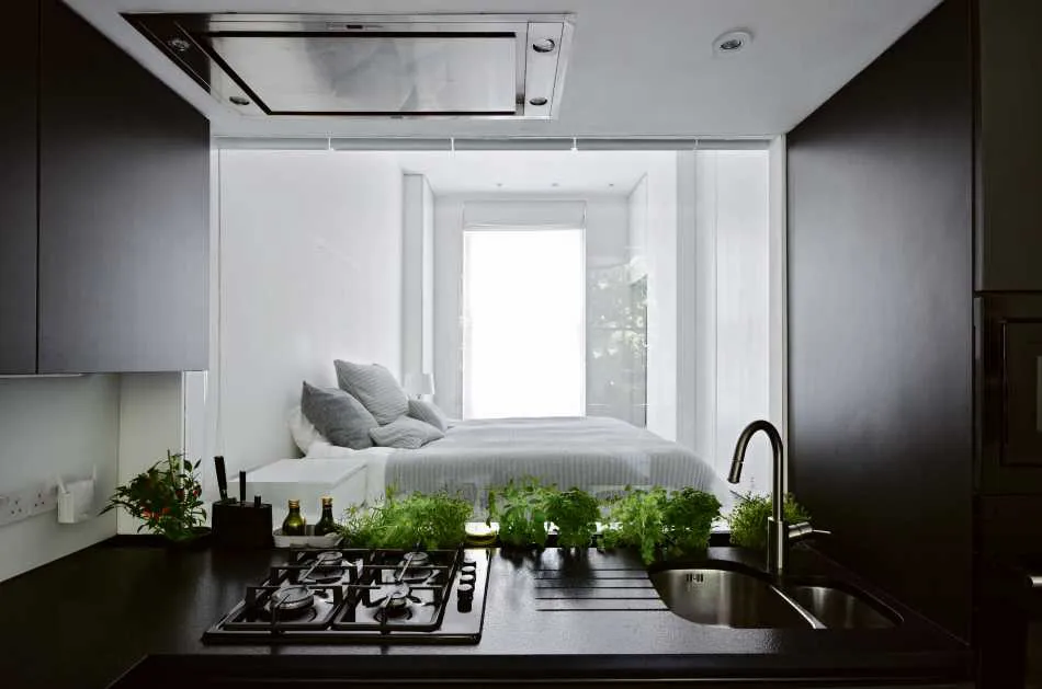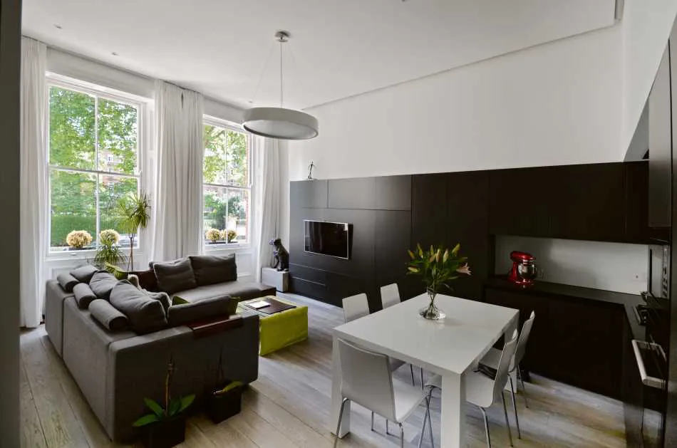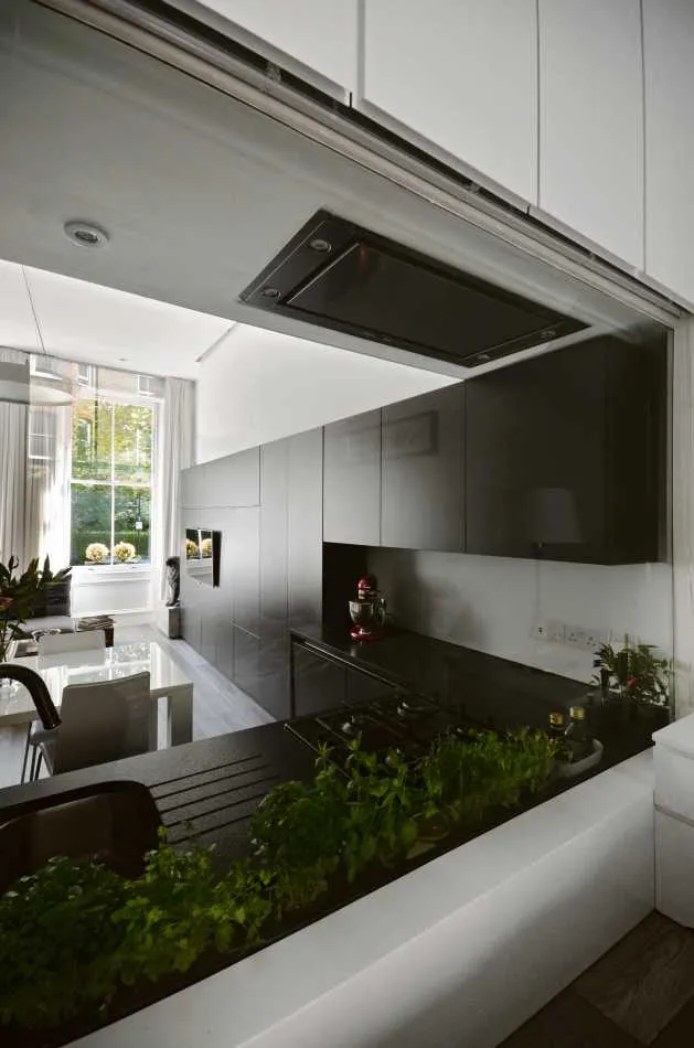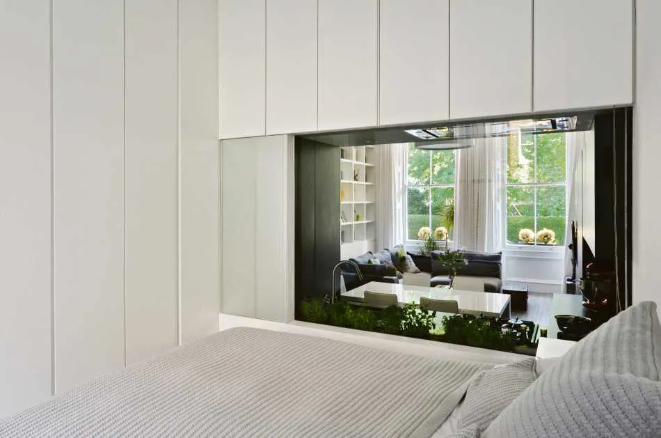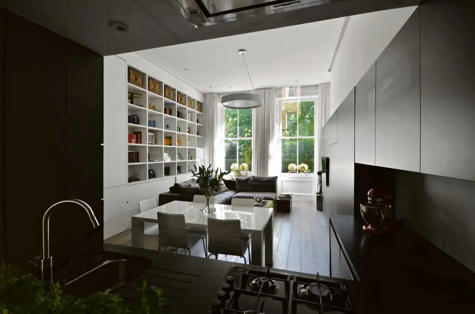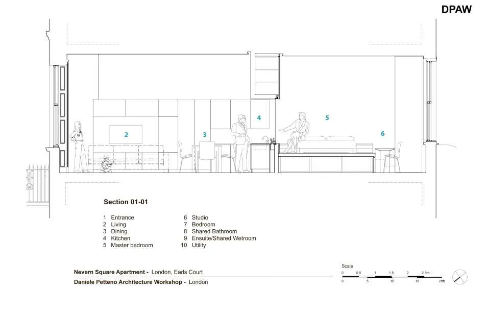 Ellos requerían: un lugar distinguido y relajante con vistas panorámicas tanto hacia los jardines de Nevern Square como hacia el de la parte trasera de la casa, luz natural en todas las habitaciones, la mayor cantidad posible de espacios de almacenamiento incorporados de forma discreta, casi invisible, un pequeño estudio para el trabajo y un área de lavado y limpieza separada. Pidieron también, conscientes de la reducida superficie en la que morarían, que se alcanzara una impresión visual de amplitud y profundidad.