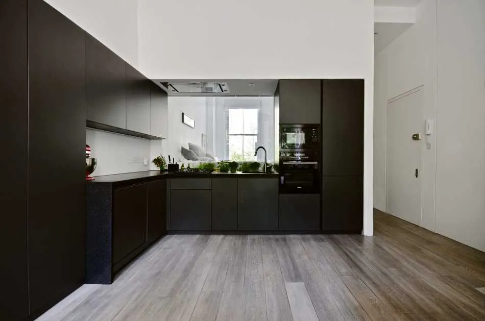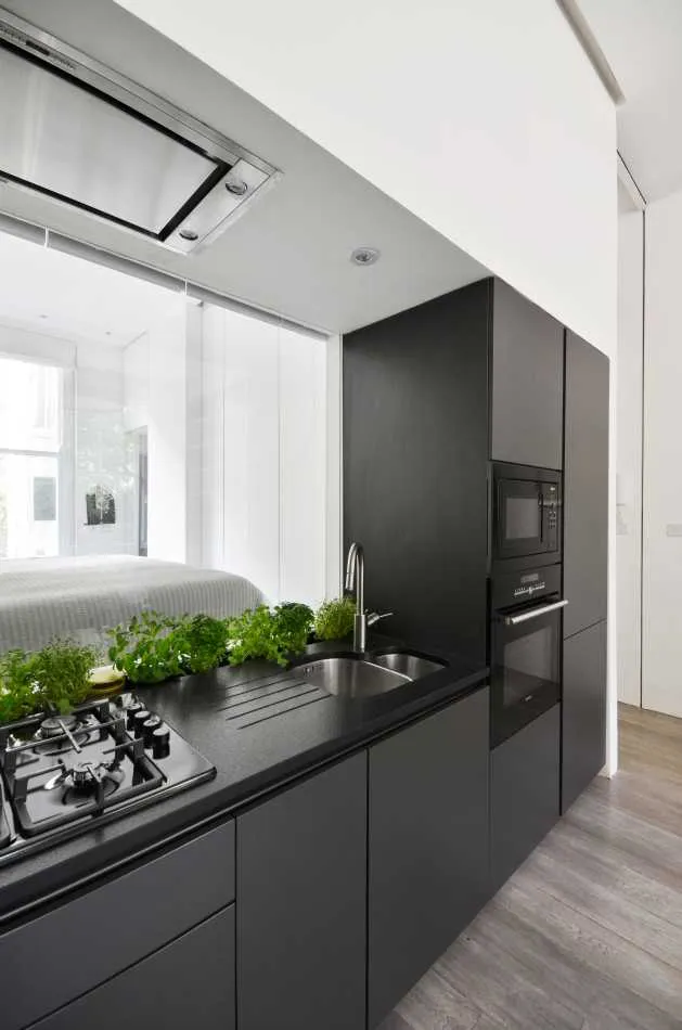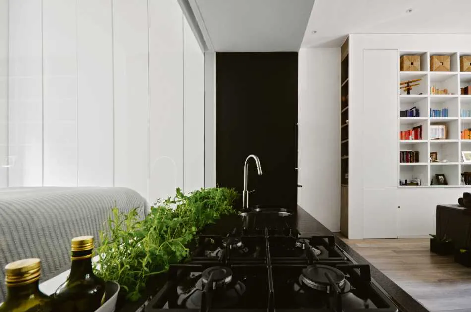 La idea de dos “L” opuestas, una blanca y otra negra, patrocina la fluidez de la línea ordenada de espacios que identifican el diseño. La blanca delimita el salón- comedor-cocina–, el dormitorio principal con estudio más baño (en suite o a compartir) y, por supuesto, el pasillo, que conecta a una segunda habitación en la parte trasera. Alcanza toda la altura de la del departamento (3,80m) y cuenta con particiones que facilitan insospechados reductos aptos para el guardado.