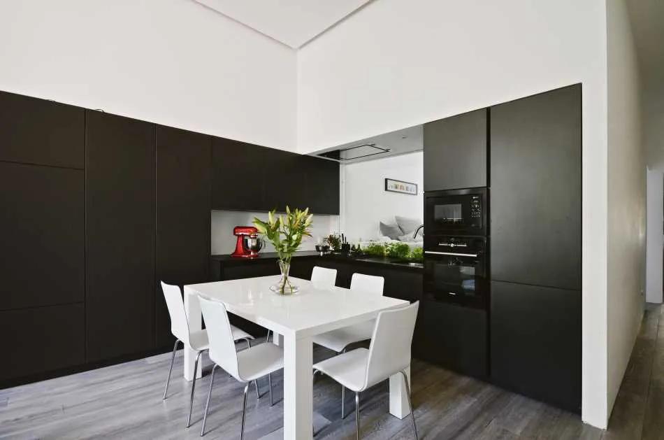 La decoración, tan moderna como sobria, ratifica que el blanco y el negro son comodines que junto a las proporciones equilibradas de llenos y vacíos, los elementos de diseño a medida , la calidad de los muebles y materiales, consiguen que un pequeño departamento del siglo XIX sea convertido en una casa elegante y práctica para una joven y creciente familia.