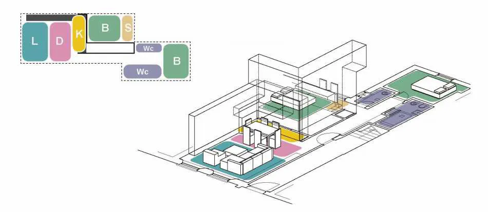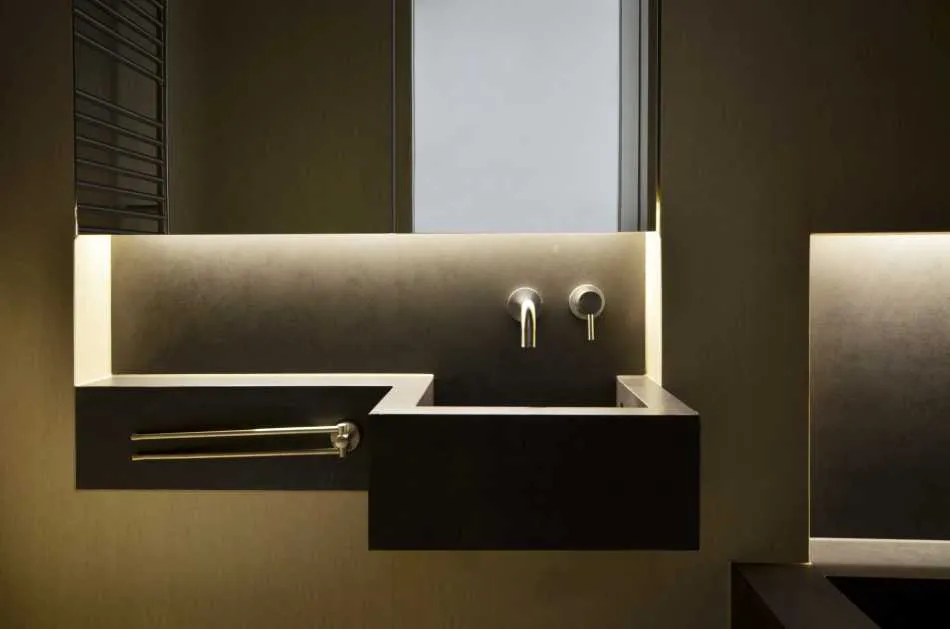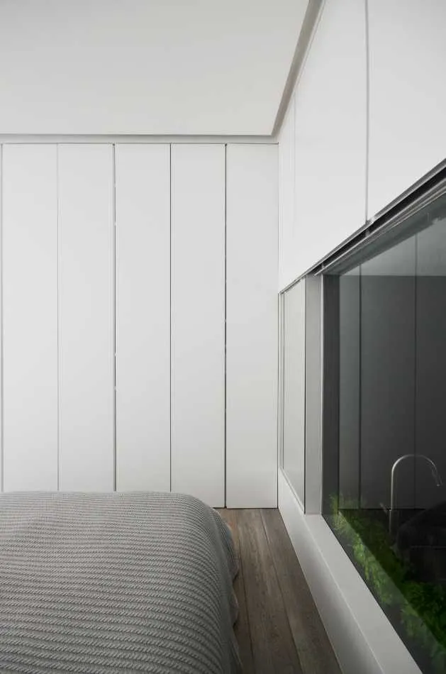 Es en la intersección entre estas dos “L” donde el proyecto expresa su sensibilidad inteligente: una amplia apertura interna agraciada por un vidrio fijo dota a las habitaciones delanteras y traseras de una profundidad visual extraordinaria y de continuidad. Refrenda a la vez el paso de la luz natural dada por los rayos directos del sol o por sus reverberaciones en la habitación contigua. Esta apertura acristalada puede ser cancelada mediante una persiana veneciana oculta si la situación así lo exige.