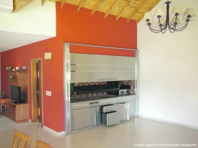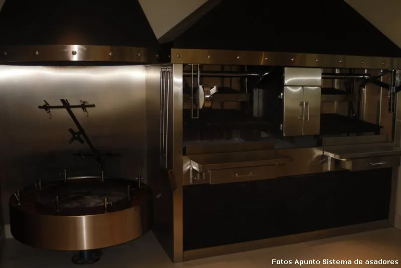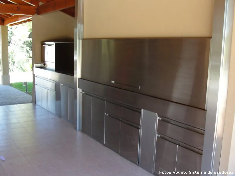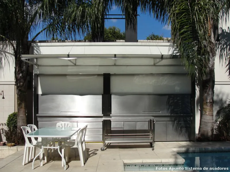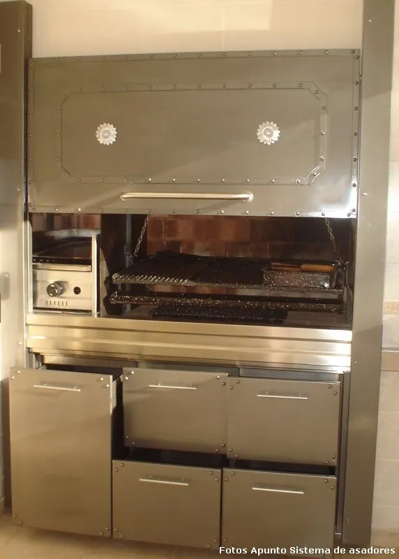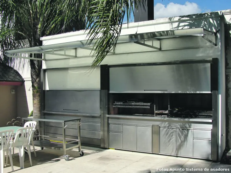 La parrilla con asador es una alternativa para todos aquellos que gustan de cocinar a la parrilla y al asador; puede colocarse aún en lugares cerrados, complementándose con diversas opciones de cerramientos, destacándose la alternativa del frente guillotina. En el caso de la parrilla con asador, es necesario contar con un espacio mínimo de 210x90 cm., ya que se requieren 90 cm para poder colocar 1 asador pangare y el espacio restante se destina a la parrilla.