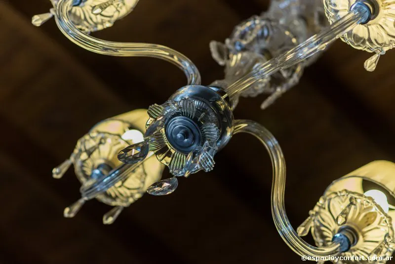 La iluminación también se resolvió de manera contrapuesta, arañas antiguas y apliques reciclados, en combinación con leds de alta potencia en espacios comunes e iluminación de obras de arte.