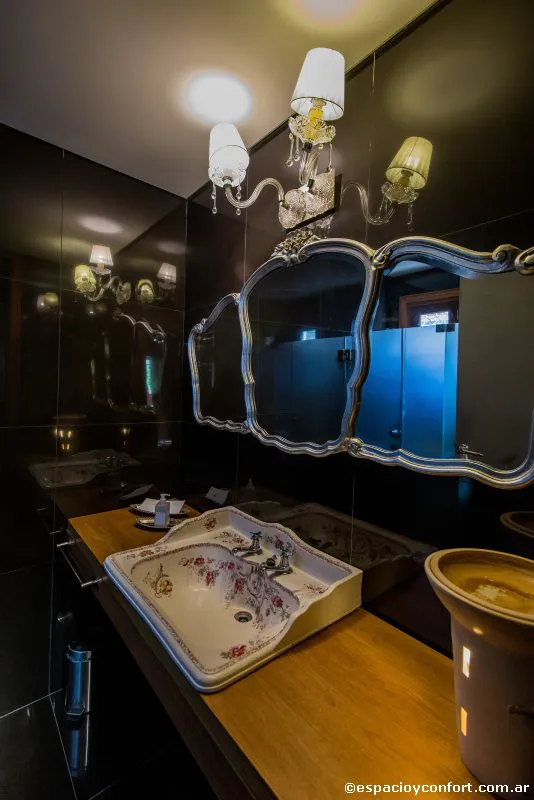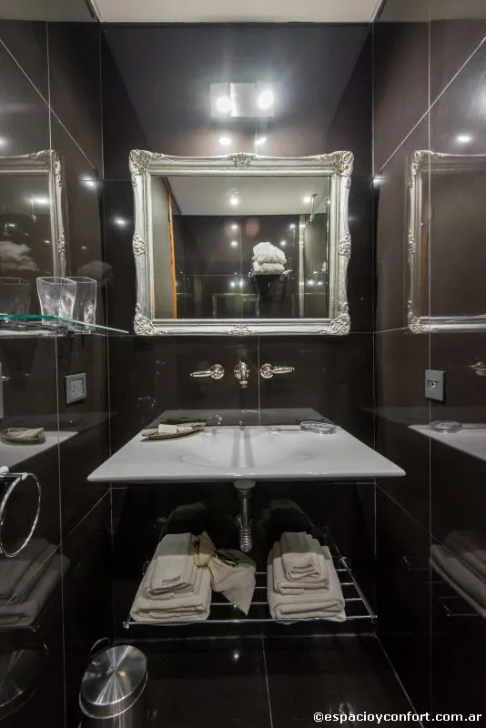 Para producir un quiebre entre las habitaciones resueltas en un corte antiguo, se contrarrestó con baños en una resolución moderna, detalles en acero inoxidable, en blanco y negro y sumamente despojados, los porcelanatos texturados y todos los espejos antiguos plateados a la hoja.