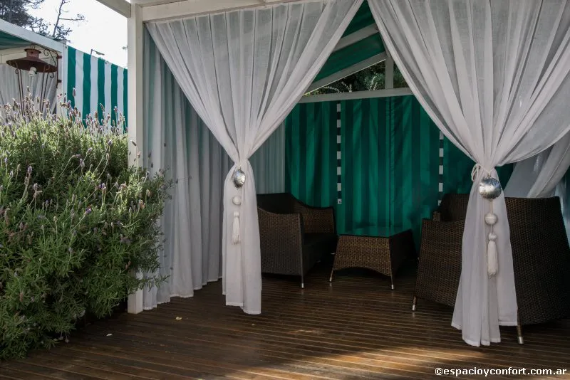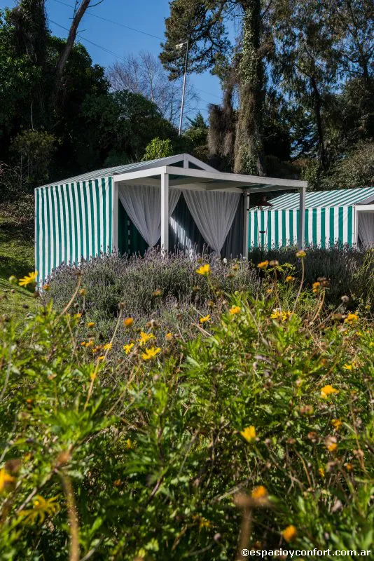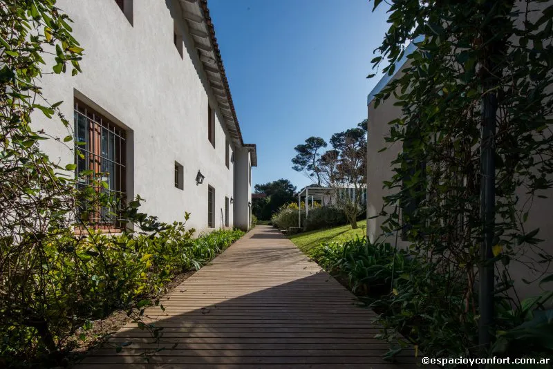 Para la ejecución del exterior se resolvió un jardín simple, con pocas variedades, recreando los antiguos jardines de la zona. En el patio, se ubicaron carpas para masajes al aire libre, gimnasio, solárium y pileta, con una terraza que invita a quedarse.