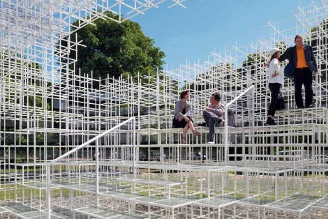 A orillas del lago Serpentine, en los jardines de Kensington, dentro del Hyde Park en Londres, se lleva a cabo cada año esta galería de arte, con exposiciones que se centran en el arte moderno y contemporáneo, y actividades relacionadas con la arquitectura, la educación y sus programas públicos, que cada año atraen a más de medio millón de visitantes. Desde el año 2000, Serpentine Gallery selecciona a un equipo de arquitectos de prestigio internacional para diseñar un pabellón en los jardines de la galería, como una pequeña muestra práctica de arquitectura contemporánea. Por allí pasaron, entre otros, Zaha Hadid, Oscar Niemeyer, Toyō Itō, Frank Gehry, Peter Zumthor, Herzog & de Meuron, entre otros. Este año, el elegido para la intervención arquitectónica que se realiza en el Kensington Garden fue Sou Fujimoto, el tercer arquitecto japonés en aceptar esta invitación. Reconocido actualmente como uno de los más populares del mundo, Fujimoto (nacido en 1971) destaca en sus obras la inspiración por las estructuras orgánicas, tales como el bosque, el nido y la cueva, y sus edificios suelen habitar un espacio entre la naturaleza y artificialidad, reinventando la relación con el entorno construido.